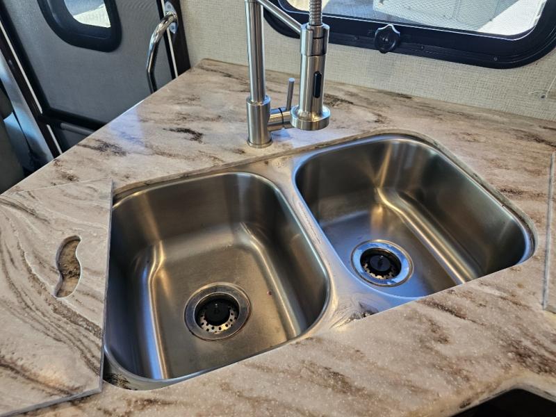 - Spacious Living Area: Dual slides create an open and inviting main living space. The L-shaped sofa and optional free-standing dinette provide plenty of seating options.