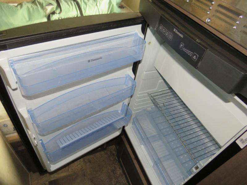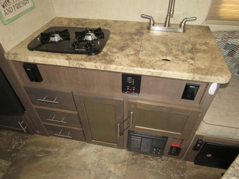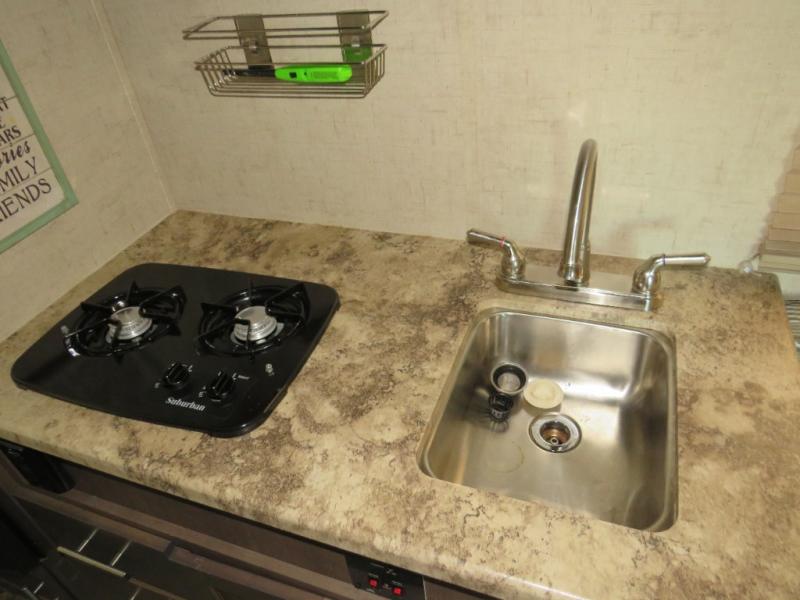 Opposite the door side there is a refrigerator beneath the counter, a two burner cook-top, plus a single bowl sink for washing up. There are also overhead cabinets for your dishes and things.