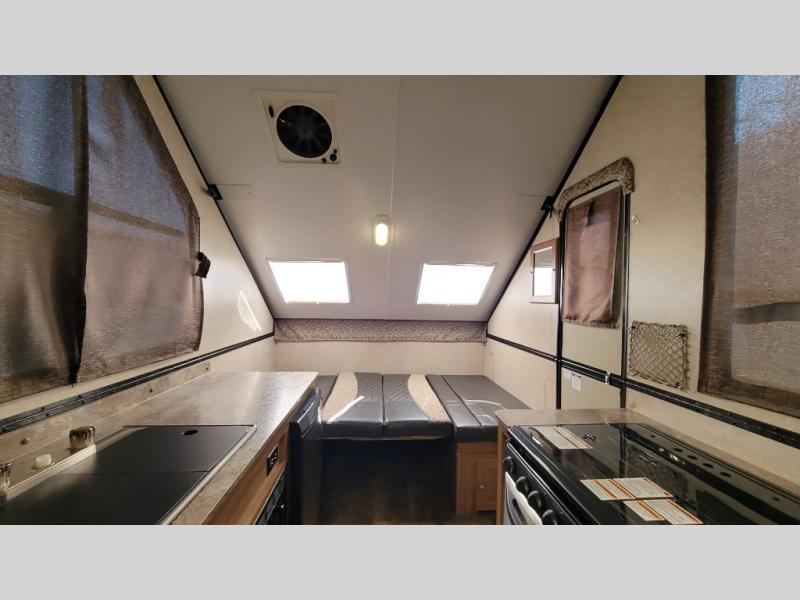 As you enter this Rockwood Hard Side High Wall Series A212HW folding pop-up camper by Forest River, you will find that there is a 50" x 80" front booth dinette. The dinette folds down to provide sleeping space for TWO if you like.