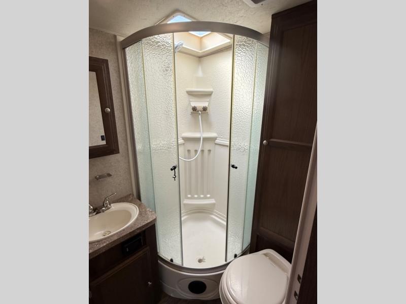 The rear corner bathroom includes a sink with overhead medicine cabinet, radius shower, and a toilet with linen storage above.