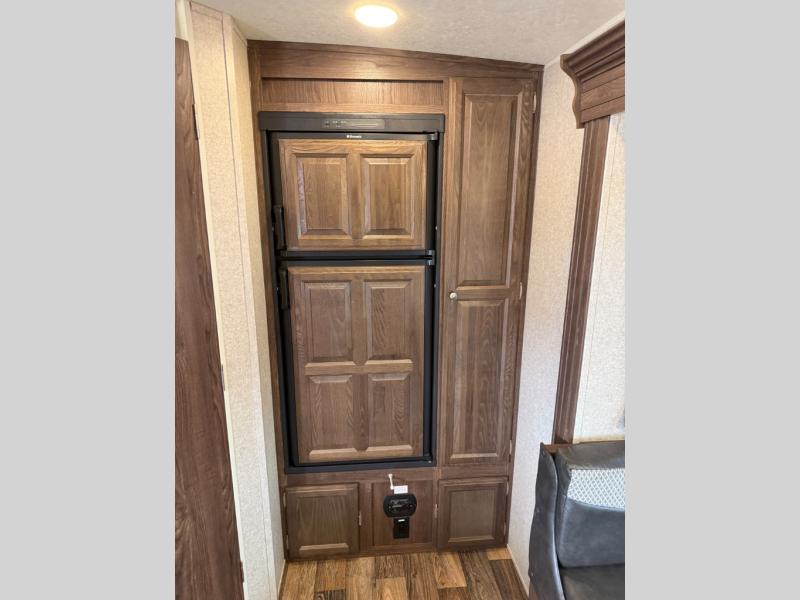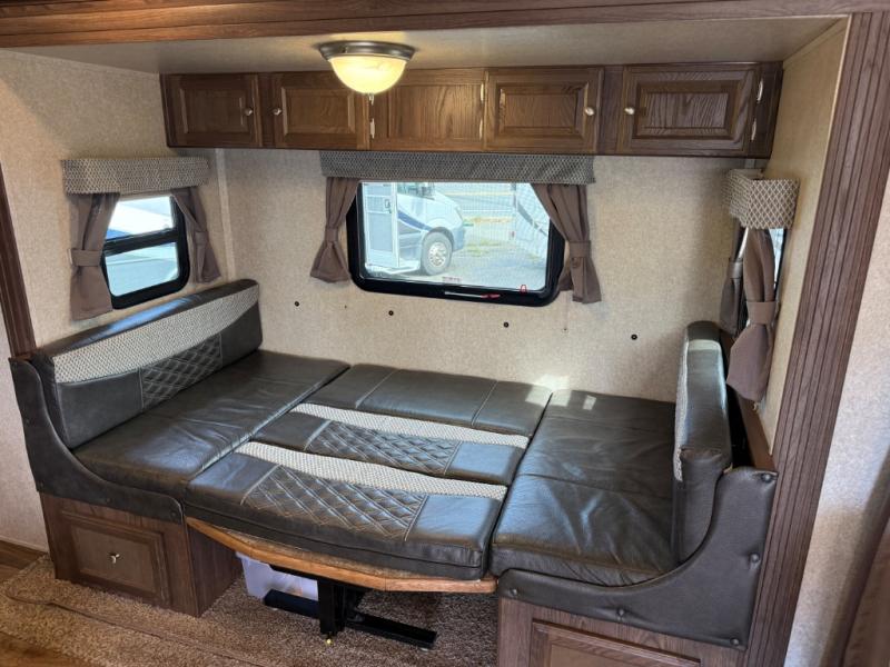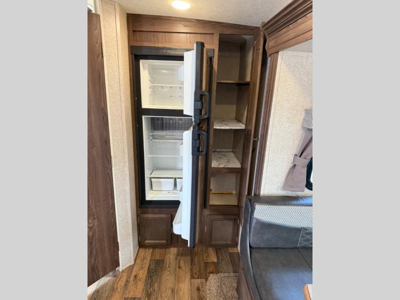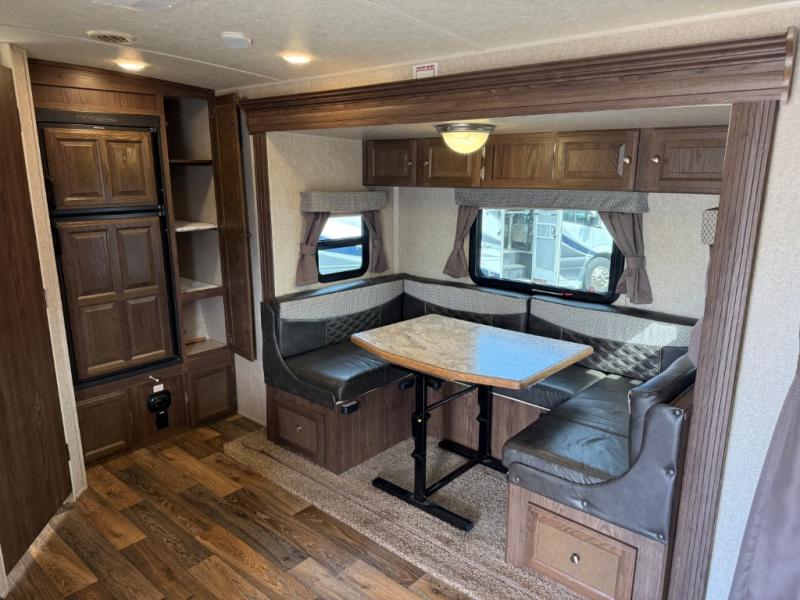 As you enter 2104S to your left there is a three burner range with entertainment center above, and a double kitchen sink with overhead microwave. There is also a refrigerator and pantry along the rear wall for your food storage needs. The u-shaped dinette and overhead storage is located on the slide out, which gives more open floor space in the travel trailer.