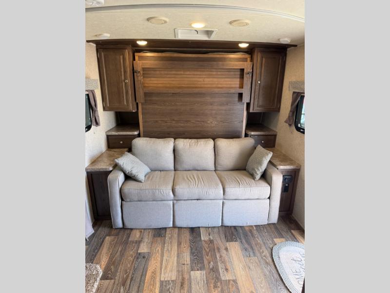 In the front, you will find a queen bed, dual wardrobes and nightstands, plus overhead storage.