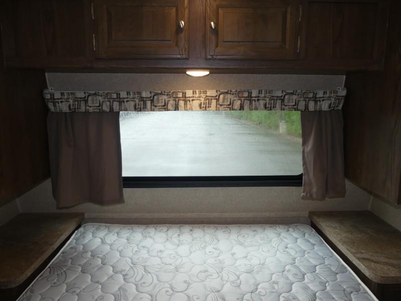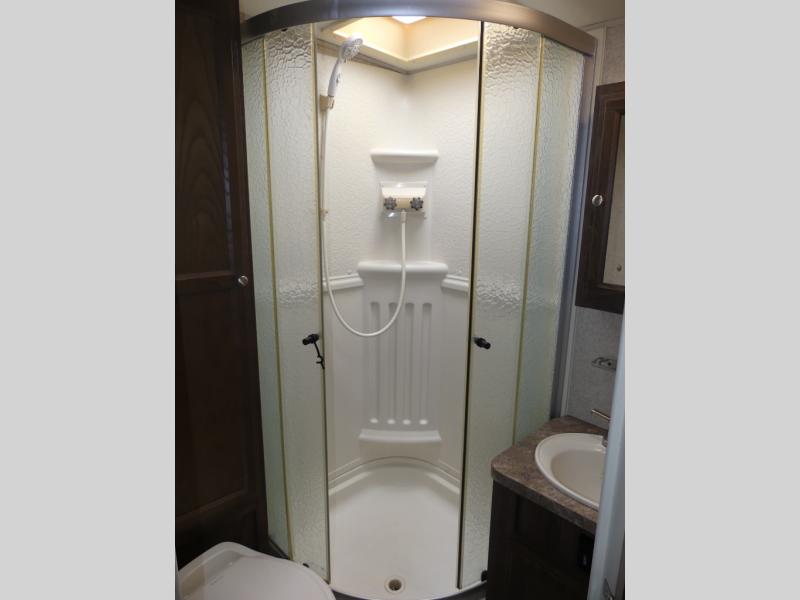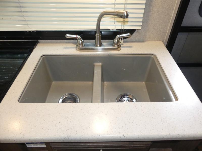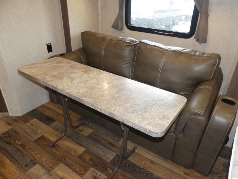 You can relax or dine at the sofa slide out along the road side wall. There is a 55" x 18" table and cup holders for convenience as well. The opposite side of the travel trailer has a counter space, double kitchen sink, three burner range, microwave, and a countertop extension. You will also find an entertainment center for your inside enjoyment.