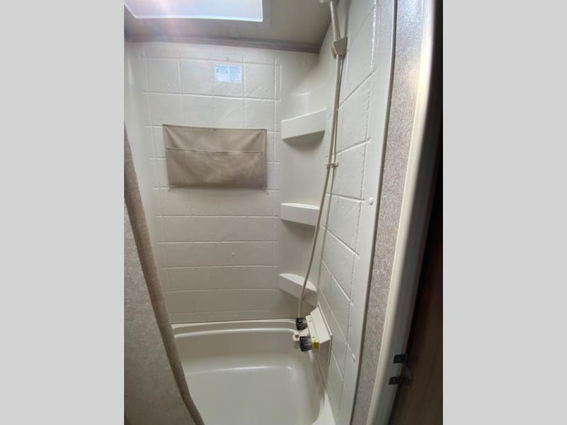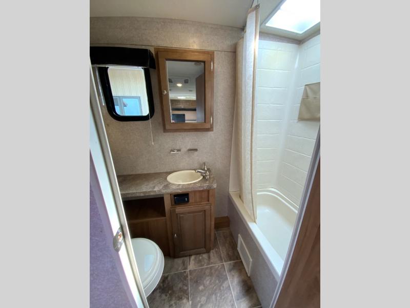 The main entry is near the rear of the trailer. As you enter to your left you will find the rear bathroom. Inside there is a tub, vanity with sink, medicine cabinet, toilet, and wardrobe. To your right you will see the main living and kitchen area.