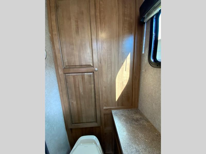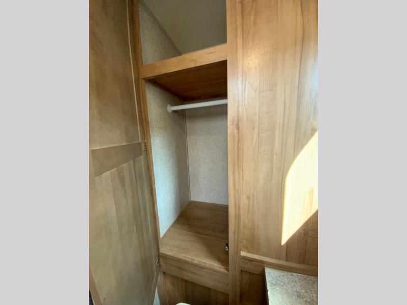In the front, you can rest on a 60" x 74" bed with flip-up storage below. Wardrobes, nightstands, overhead cabinets, and a second entry door into the trailer can also be found in the bedroom area.