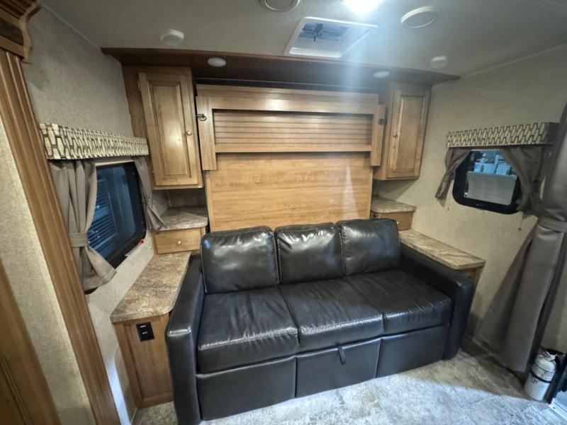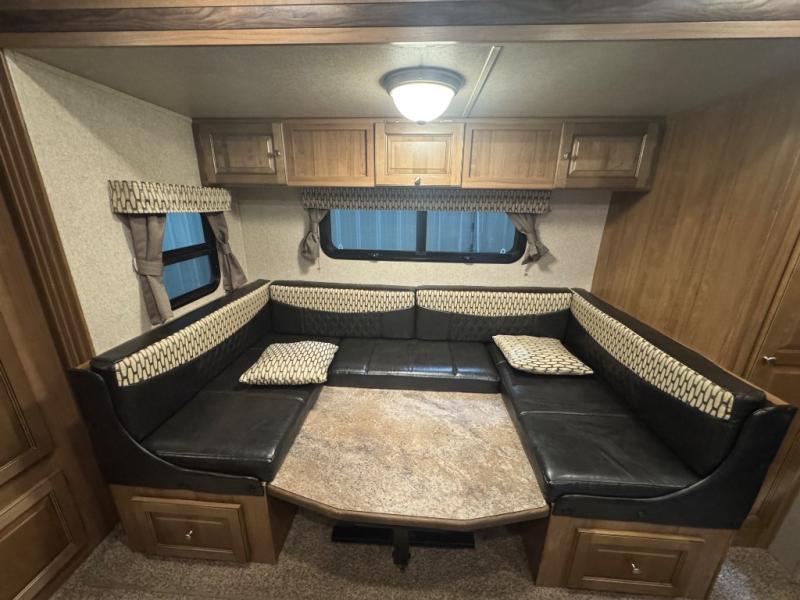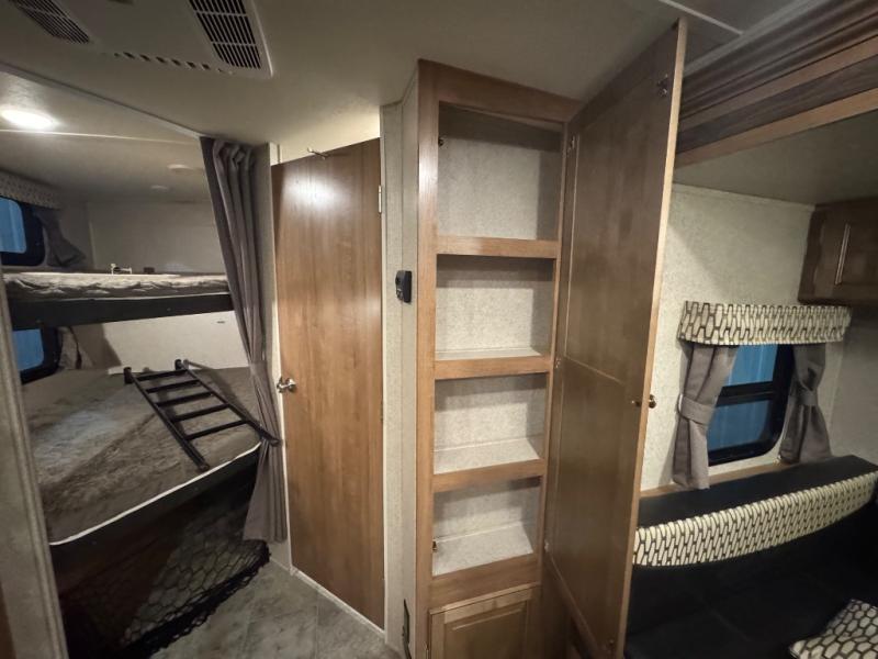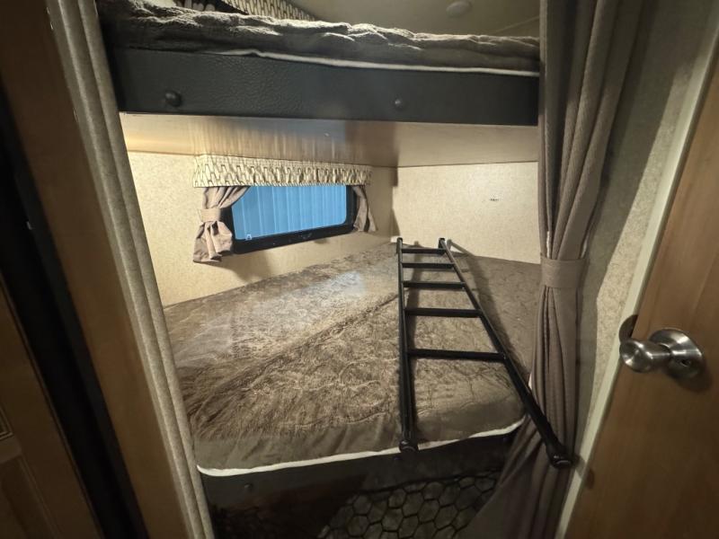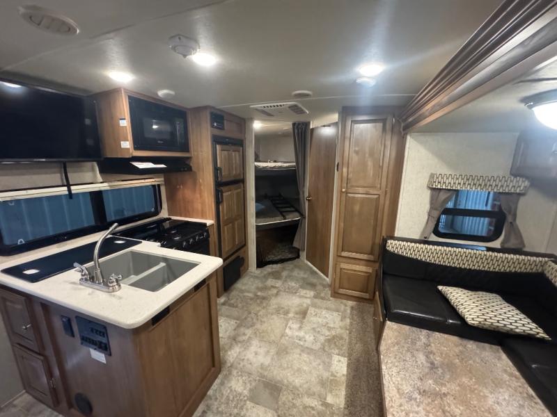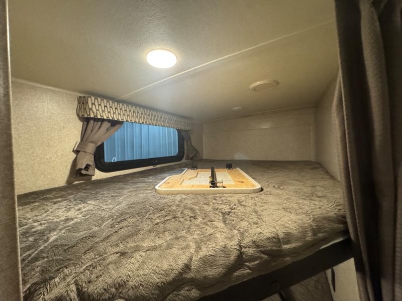 Finally, a lightweight travel trailer with double-size bunks for the kids or your guests! You'll find the versatile Murphy bed up front will be super convenient when you need more space to move around, and the 72" sofa will provide comfy seating space when the bed is put up. This model also includes a U-shaped dinette slide perfect to dine around, play games, and sleep additional guests. An LED TV in the main living area will allow you to watch your favorite shows in the evenings, or you may just find yourselves outdoors under the 18' power awning with LED lights. And check out the pass-through storage, plus additional exterior storage for your hiking gear!