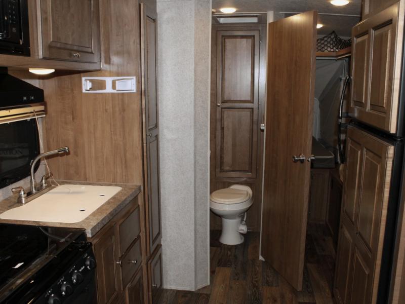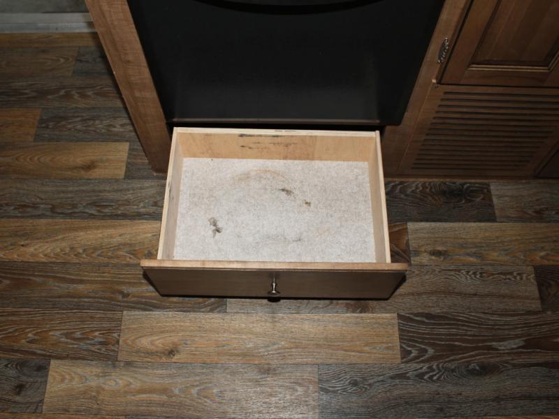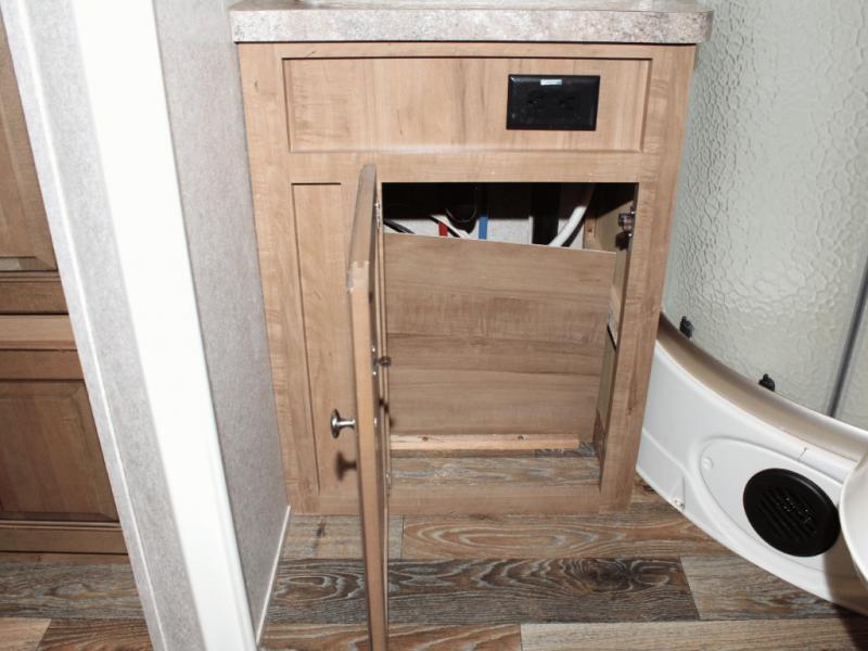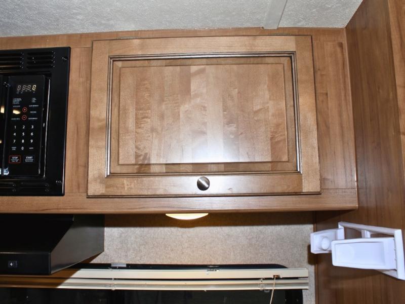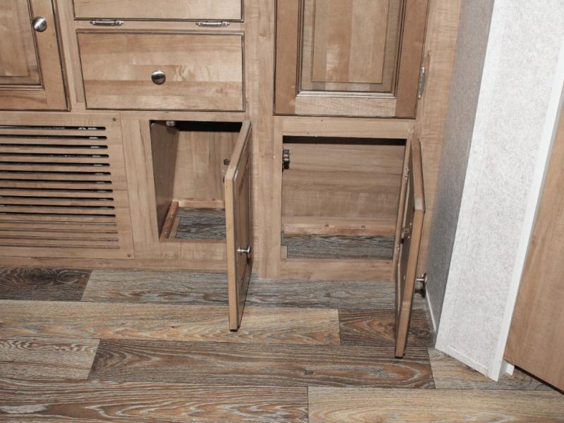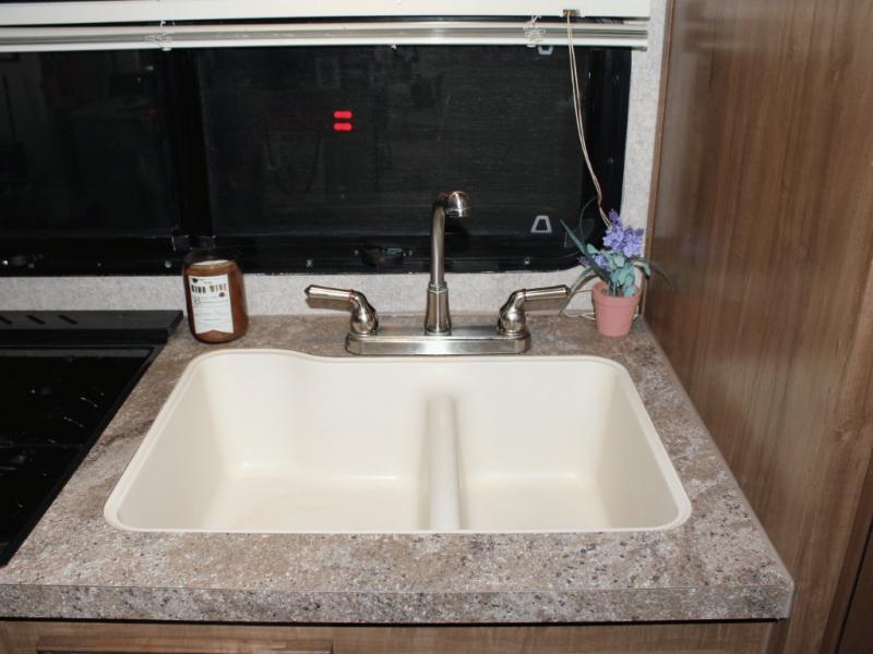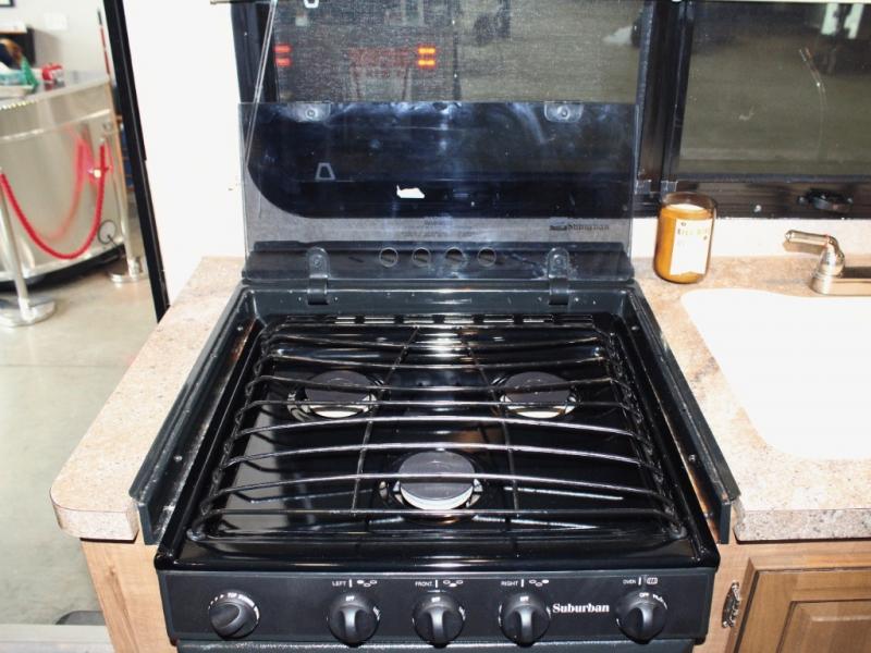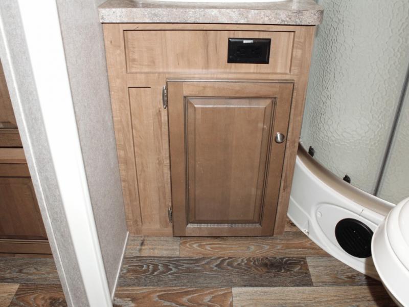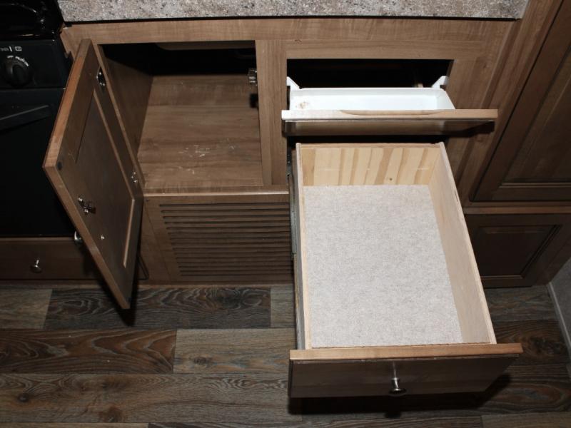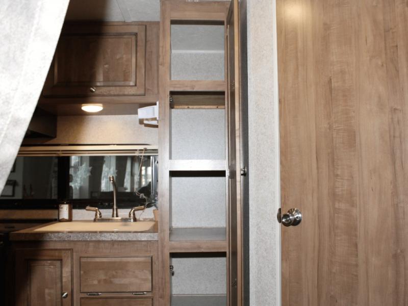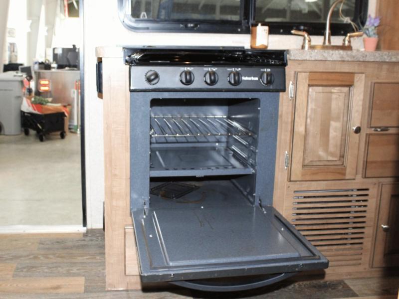 Cooking on the road is easy in the well-appointed kitchen, featuring a double sink, three-burner range, microwave, pantry, and a refrigerator conveniently located near the dinette. You’ll have everything you need to prepare your favorite meals without missing a beat.
