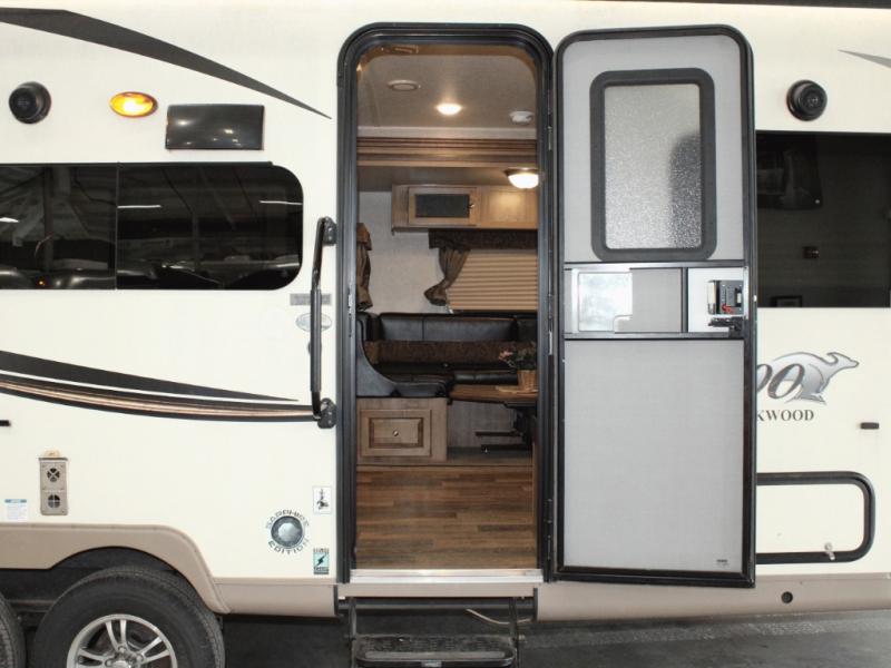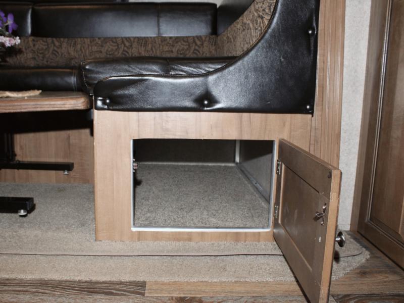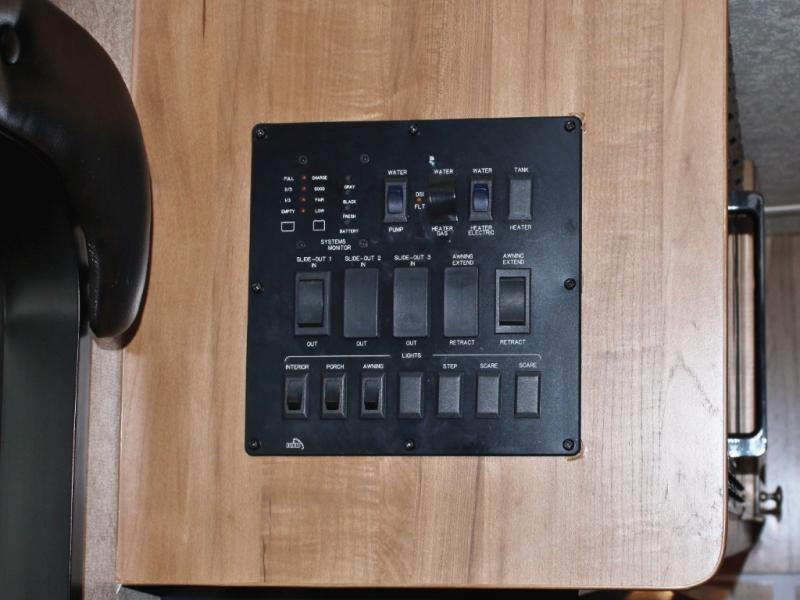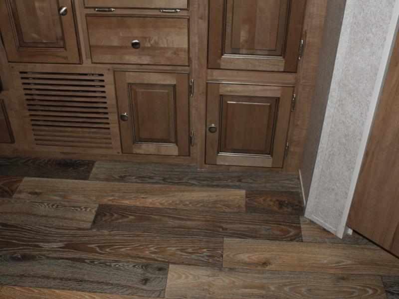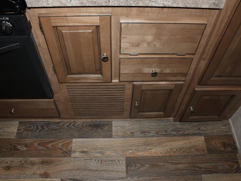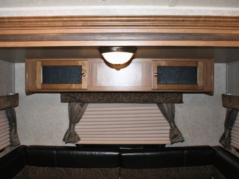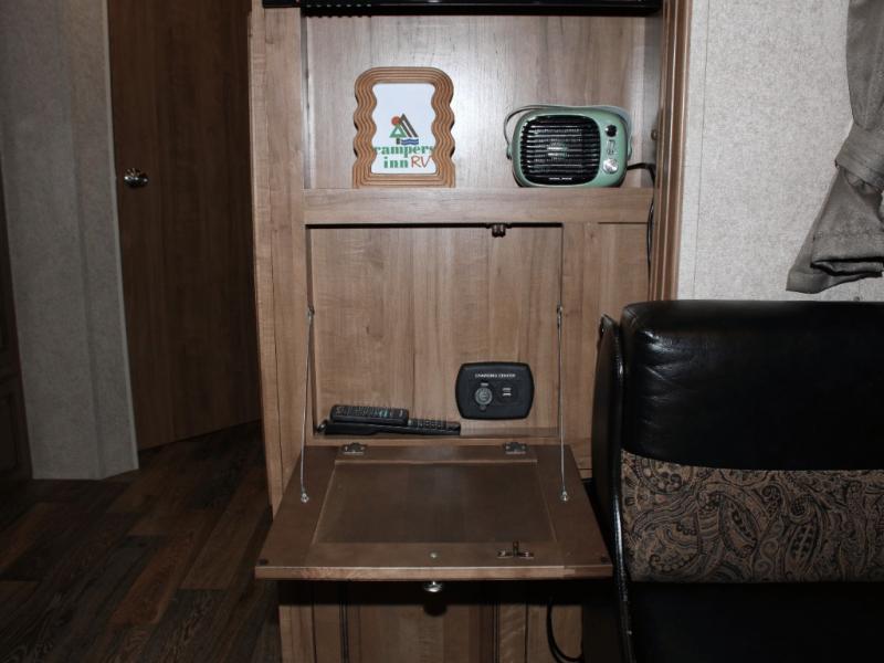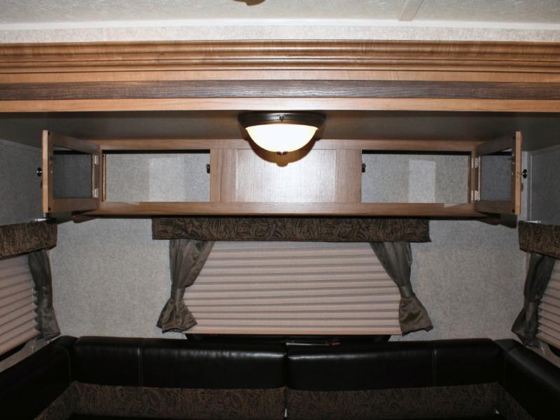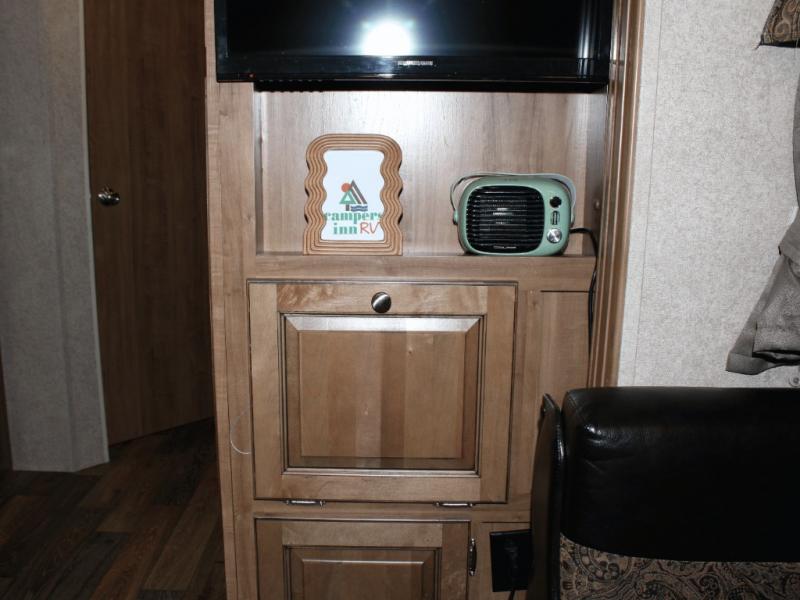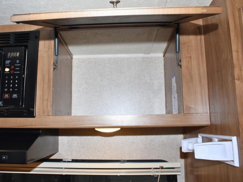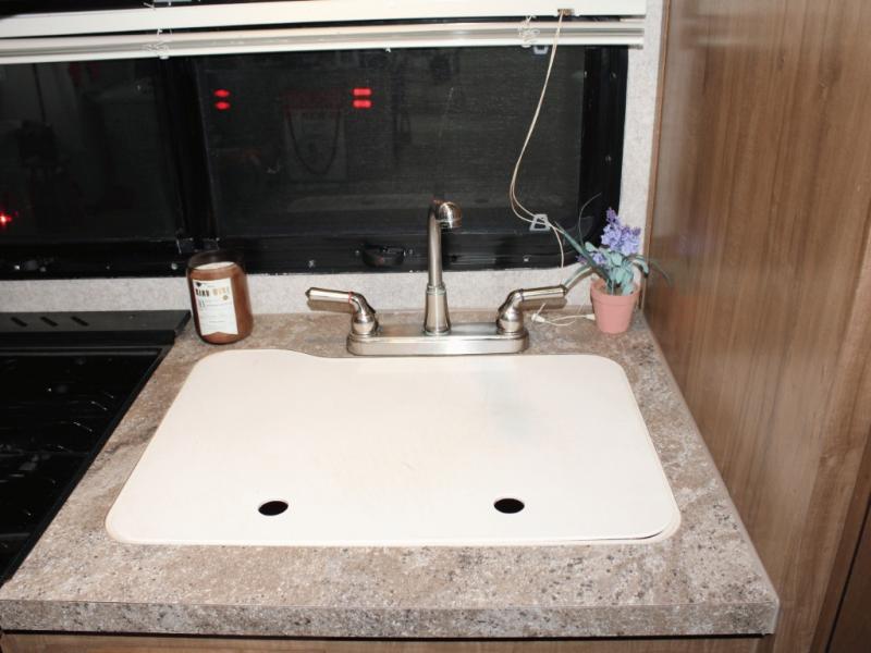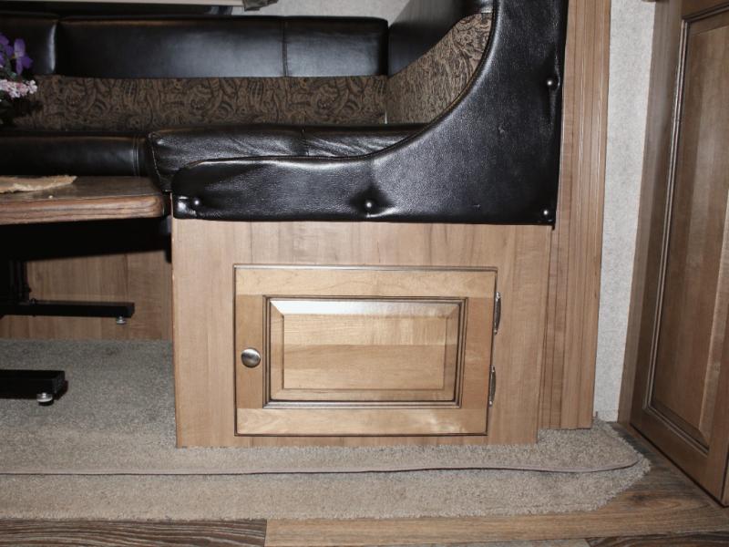Cooking on the road is easy in the well-appointed kitchen, featuring a double sink, three-burner range, microwave, pantry, and a refrigerator conveniently located near the dinette. You’ll have everything you need to prepare your favorite meals without missing a beat.