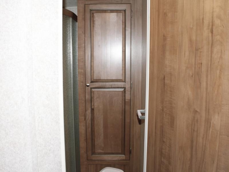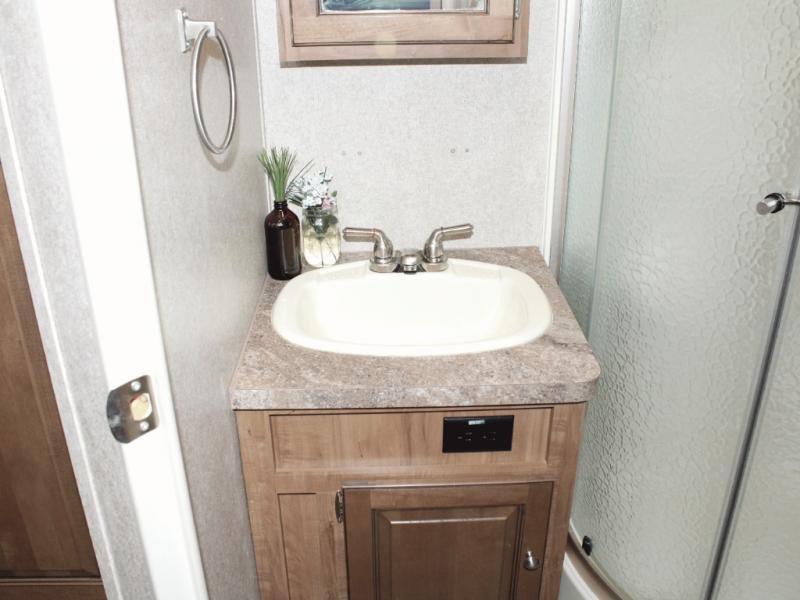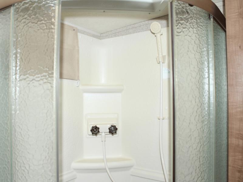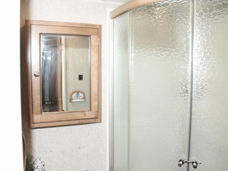 The rear corner bathroom provides all the essentials, including a toilet, radius shower, vanity sink, medicine cabinet, and linen storage to keep towels and toiletries within reach.