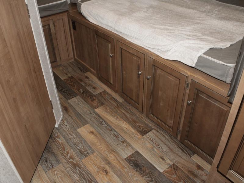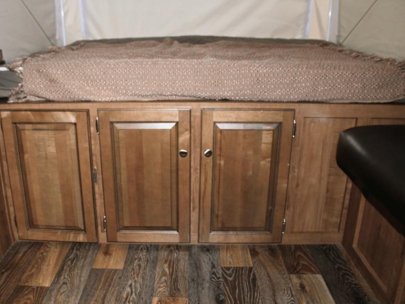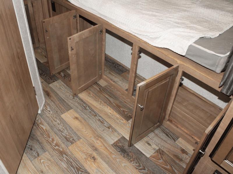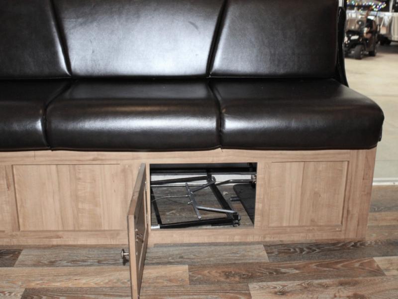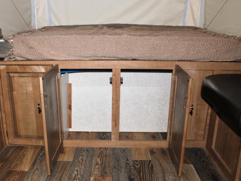 You’ll find three queen tent end beds, located at the front, rear, and roadside, offering plenty of sleeping room for the whole family or group of friends. Storage shelves above each tent opening and under-bed storage help you keep things tidy and organized, so everything has its place.