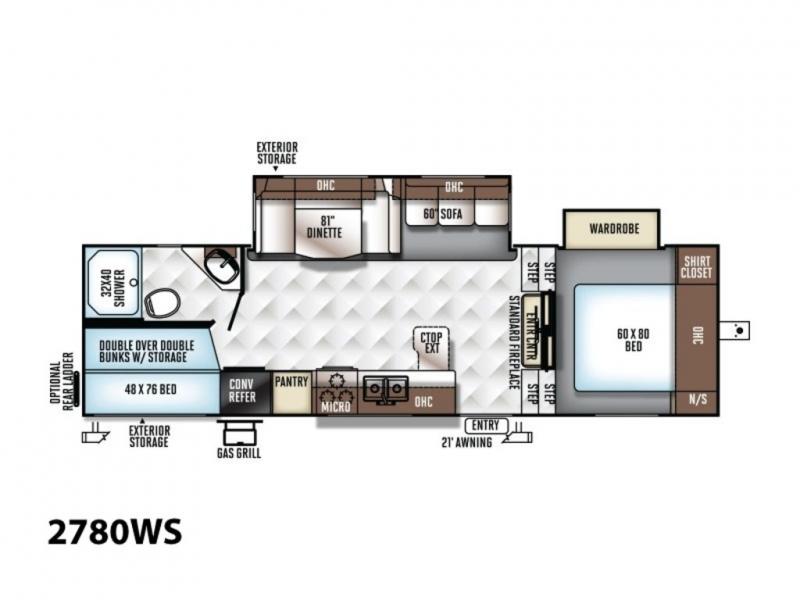 CLEAN AFFORDABLE NICE UNITStart your next camping trip with this Forest River Rockwood 2780WS double slide out fifth wheel. This model also features sleeping space for ten people, a fireplace, a set of double size bunk beds, a 81" u-shaped dinette, and two sets of stairs that take you up to the front bedroom.