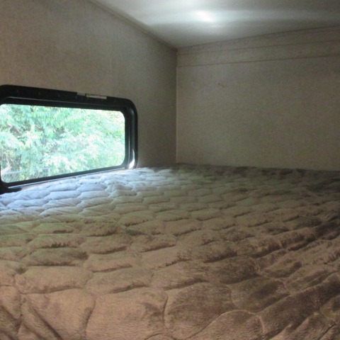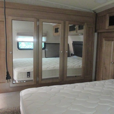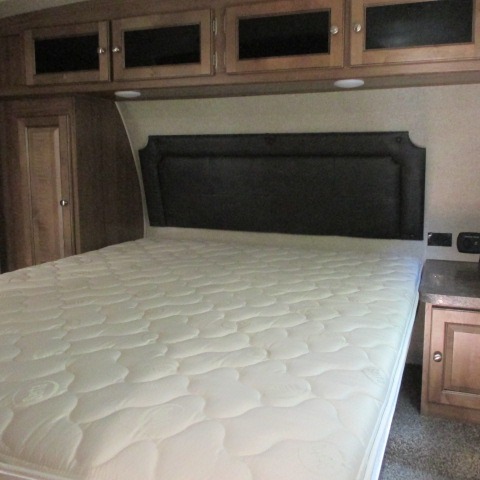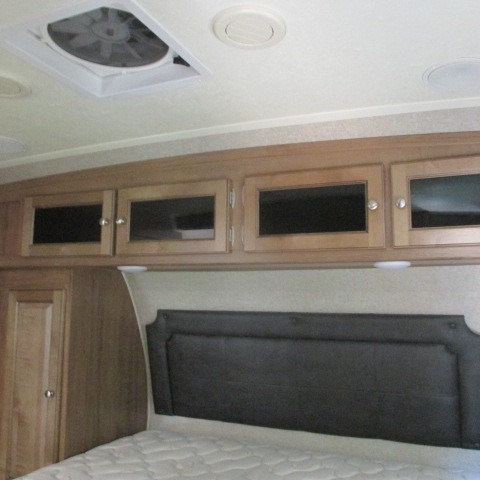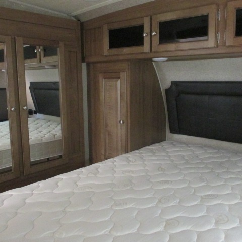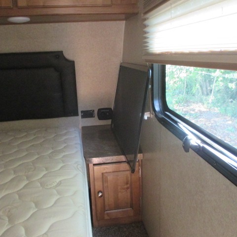 The bedroom features a queen bed, shirt closet, and a nightstand, plus overhead cabinets. Along the road side wall there is a slide out wardrobe for your hanging clothes.