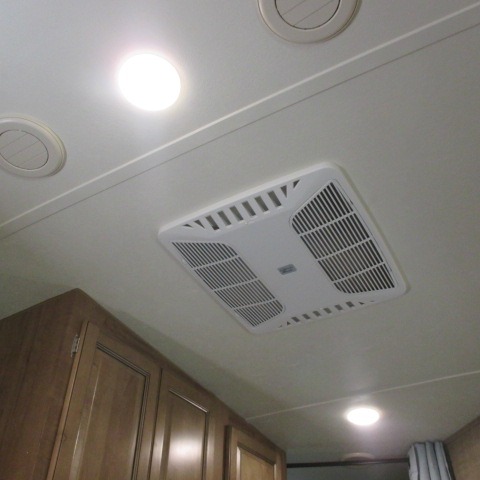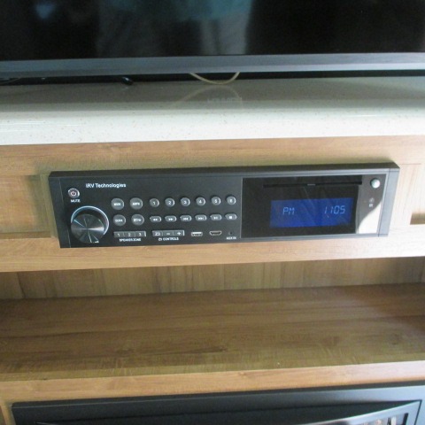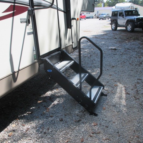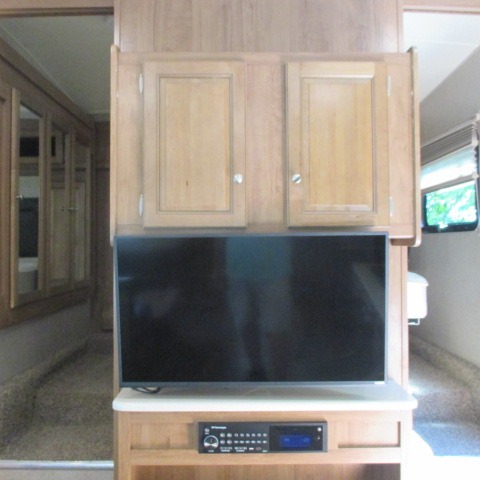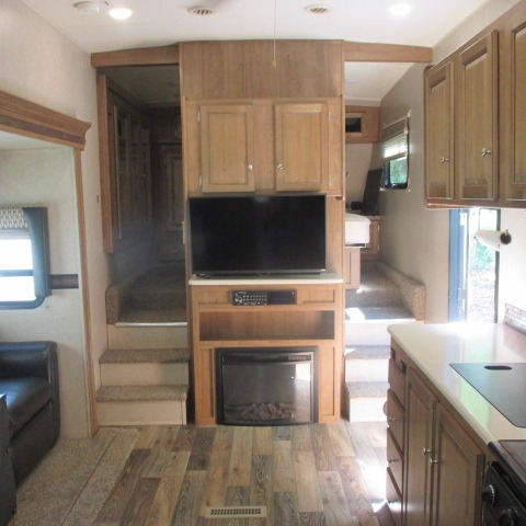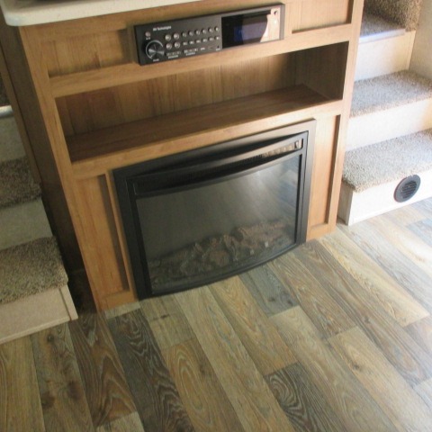 Just because you are camping doesn't mean that you cannot watch your favorite shows or movies. There is a nice entertainment center where you can catch up on a movie or two, and below the entertainment center enjoy the cozy fireplace on those chilly evenings. Located on either side of the entertainment center there are stairs which lead you into the front bedroom.