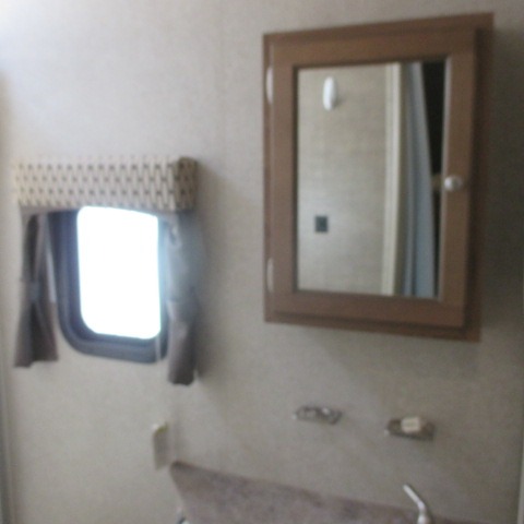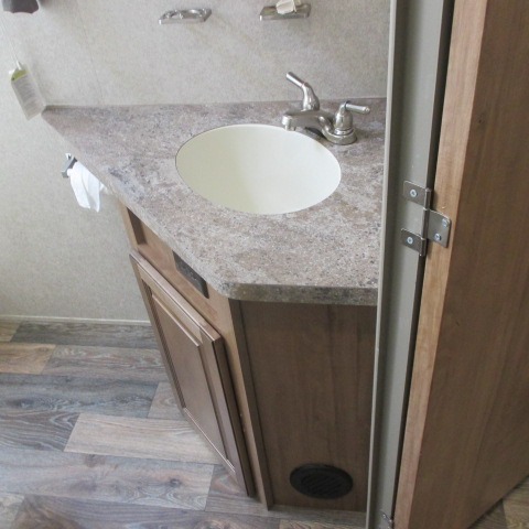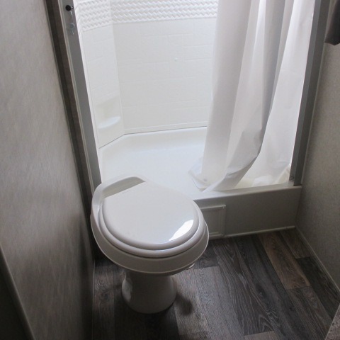 Head toward the rear, and you will find the bathroom located in the rear right corner of the fifth wheel. Inside there is a sink, medicine cabinet, toilet, and a shower.