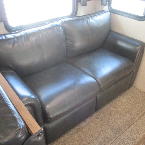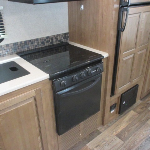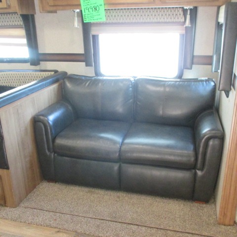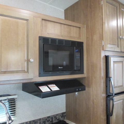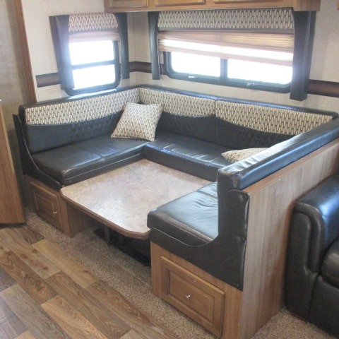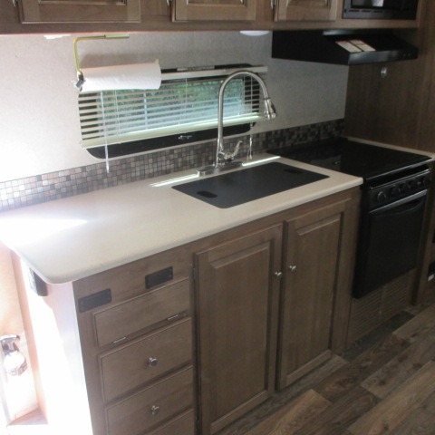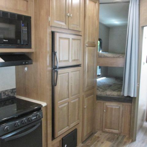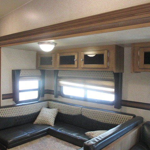 As you enter this model, you will love how open and spacious the combined living and kitchen area are. To your left of the entry there is a countertop extension which is great if you need more room for meal prep, a double sink, a three burner range, an overhead microwave. Plus there is a pantry and refrigerator for your food storage needs. On the opposite side of the room there is a slide out with a sofa and a 81" u-shaped dinette. Both the dinette and sofa feature overhead cabinets which are great for storing any personal belongings.