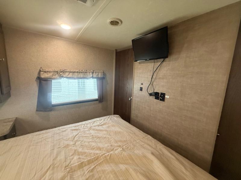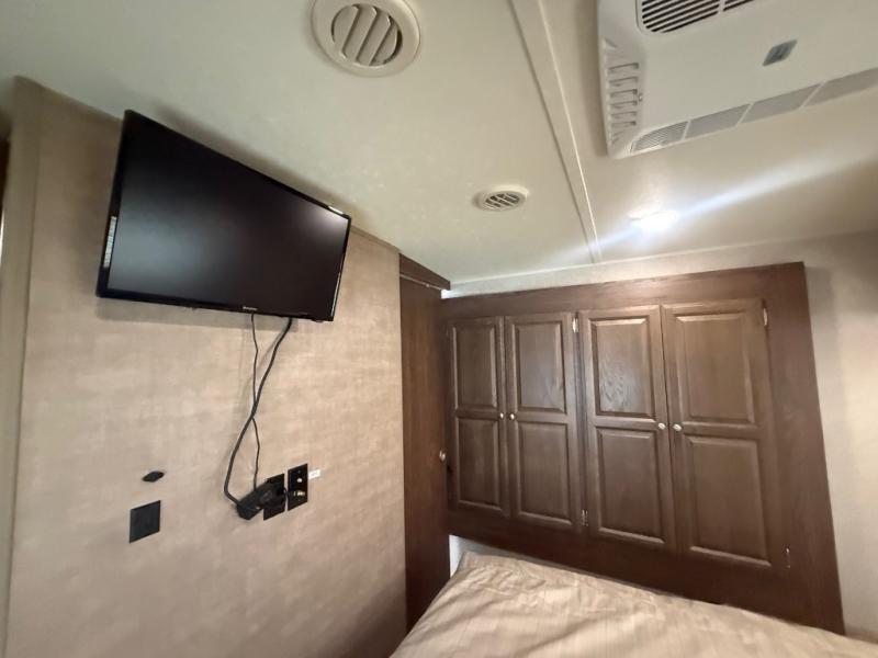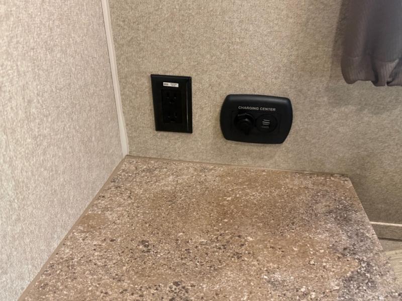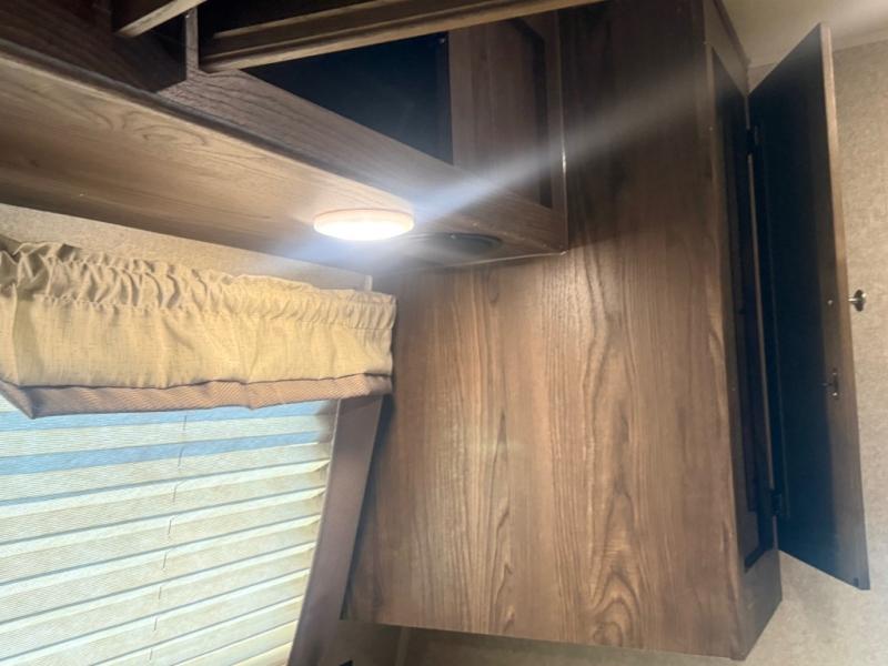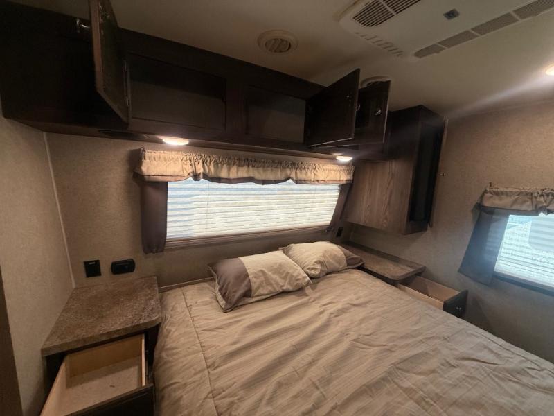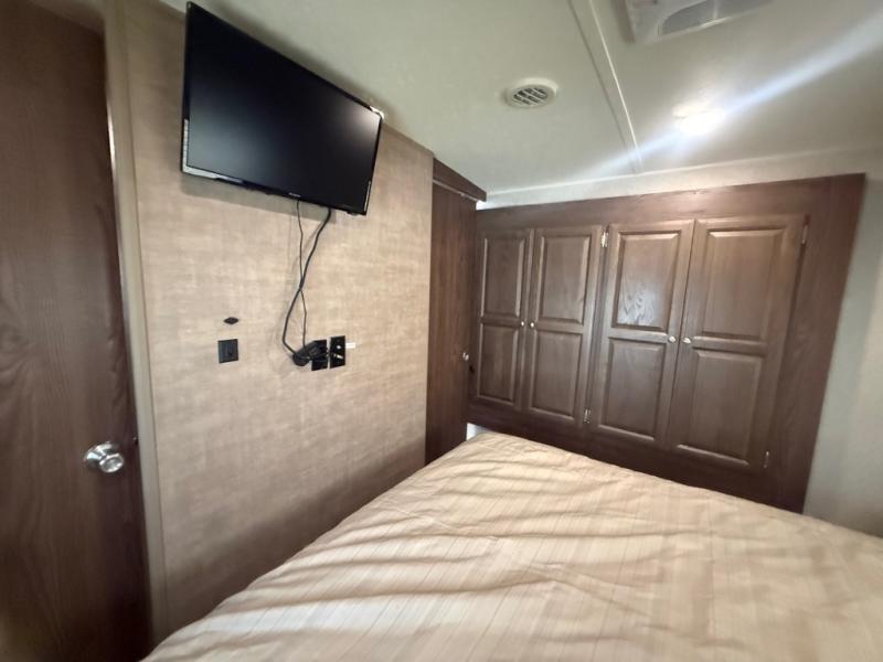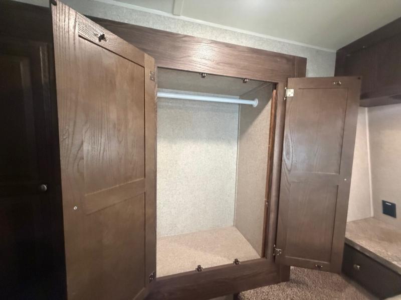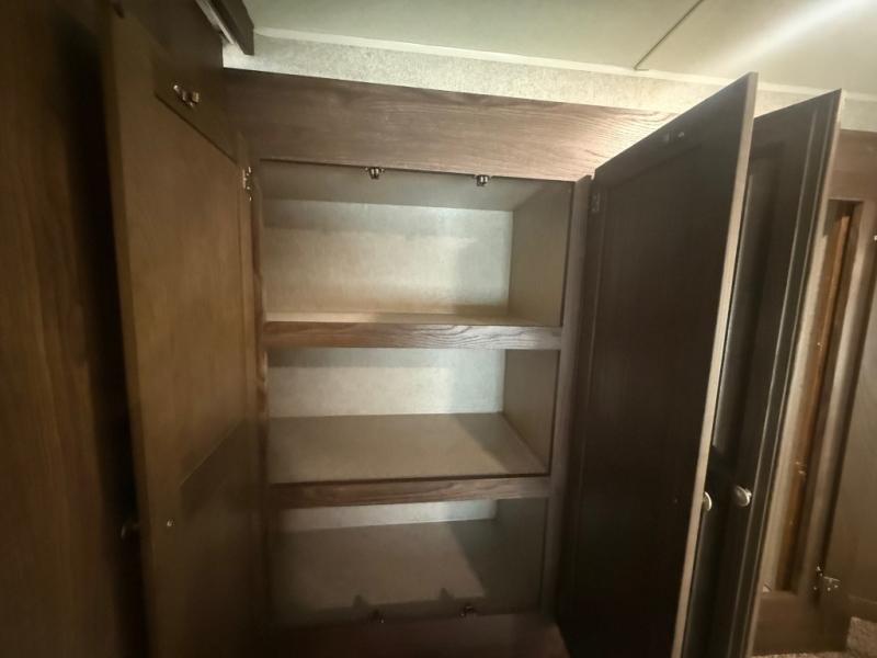 In the front bedroom you will find a comfortable Serta queen size mattress with dual bedside nightstands, and overhead storage. There is also a slide out wardrobe/linen/closet that provides added foot traffic space once extended.