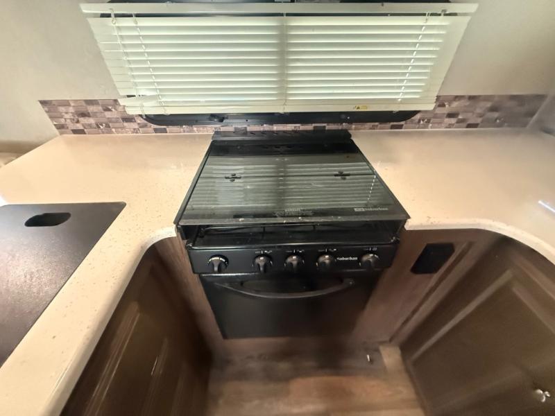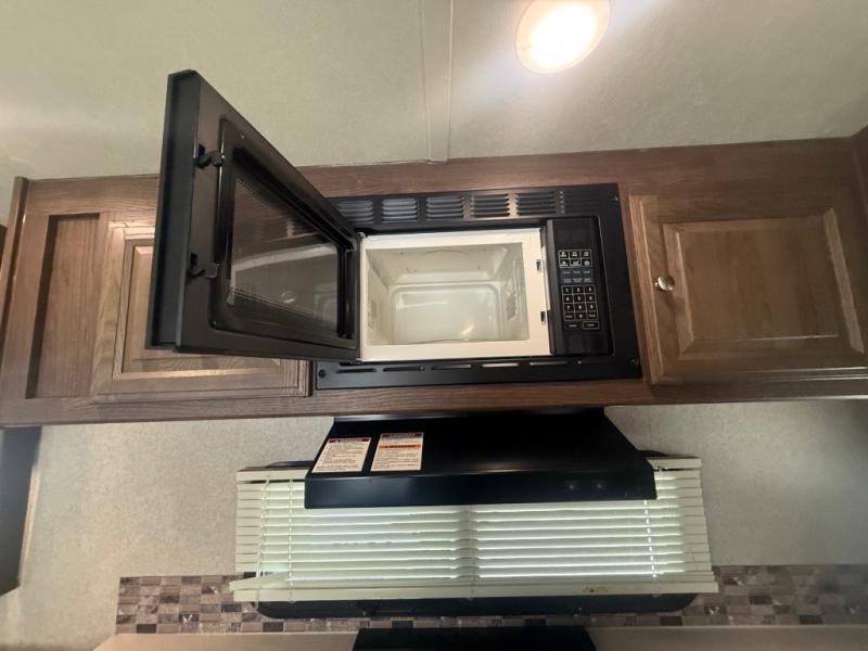 The kitchen is located in the rear of this Rockwood Ultra Lite and features a u-shaped counter with double sink and countertop extension, a three burner range including overhead microwave oven, a refrigerator, and food pantry. Cooking up light meals and snacks is quite easy with everything provided.