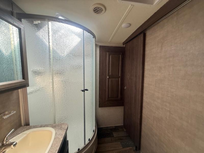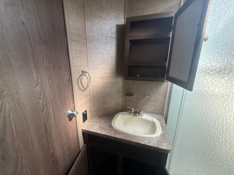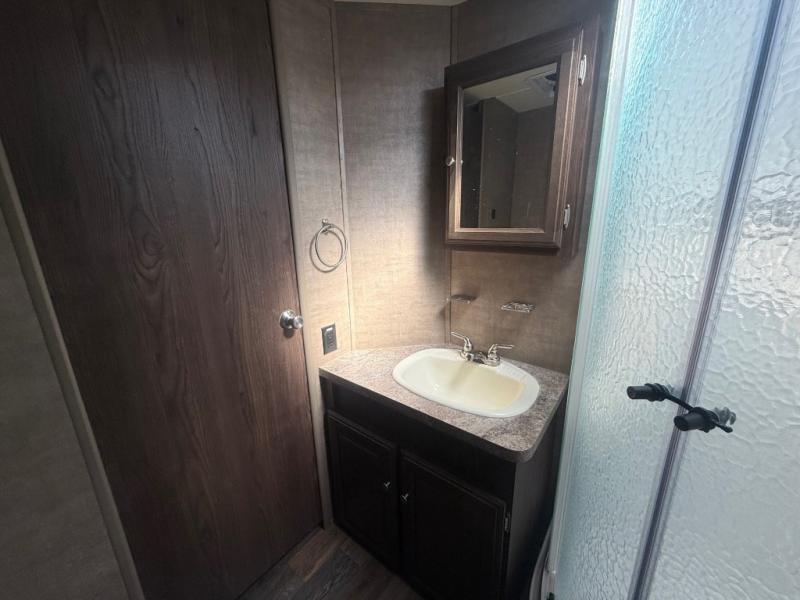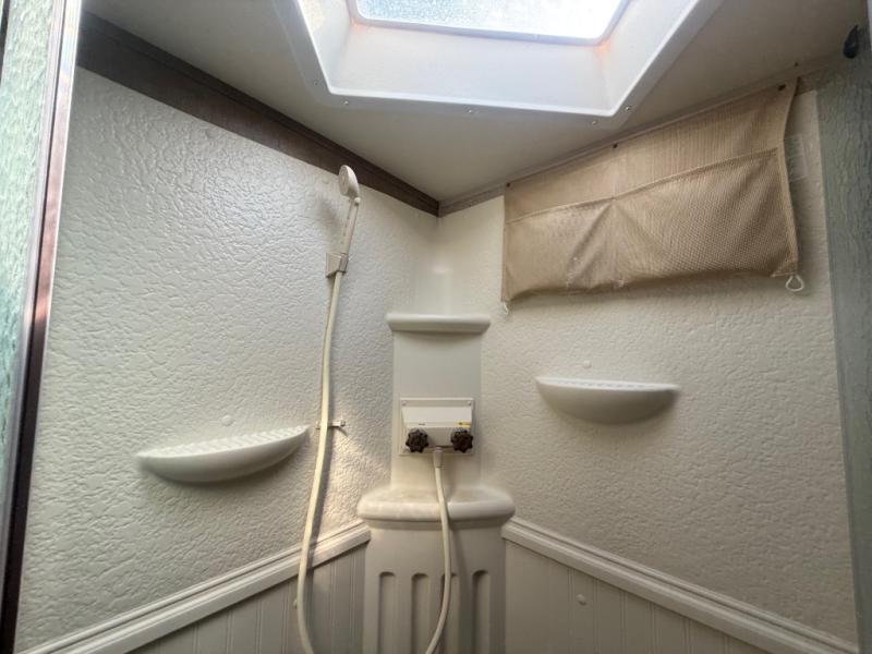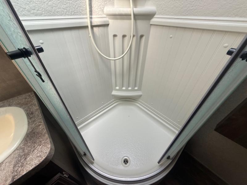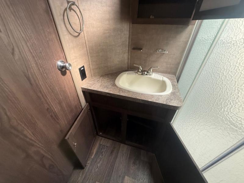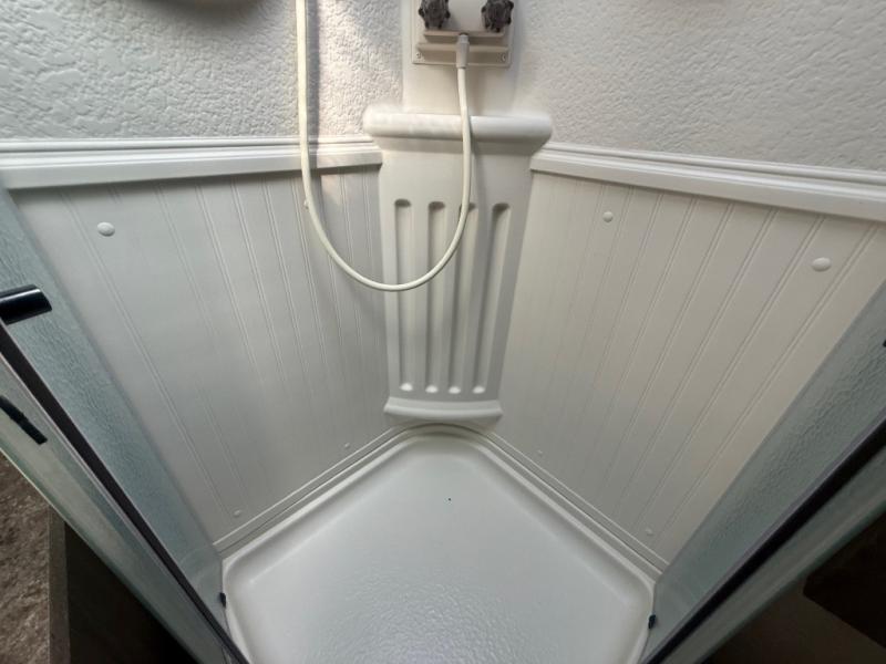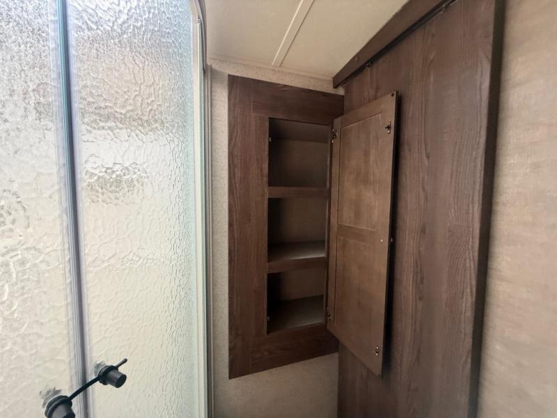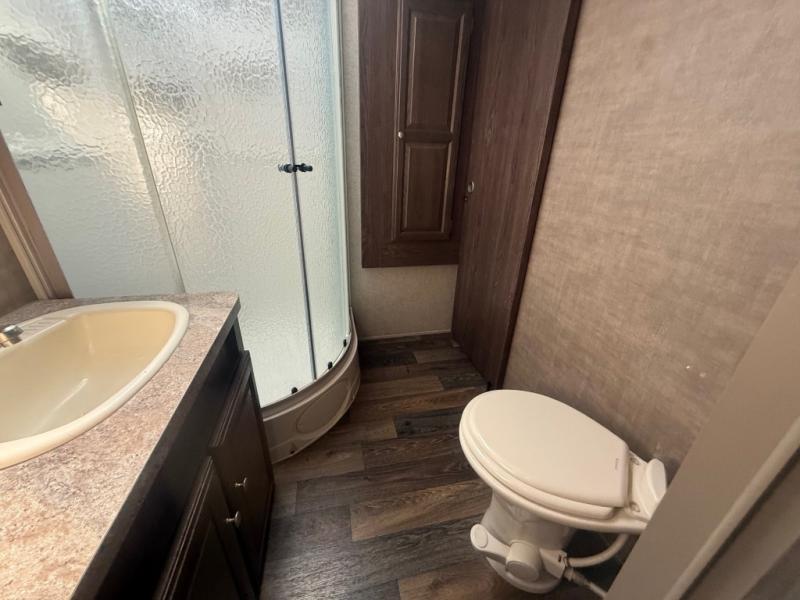 Enter and notice how convenient the full bath is located almost directly across from the door. There is even a second sliding entry door within the bathroom leading to the front master bedroom. The bath offers a radius shower, toilet, and vanity with sink. With the second bath entry and bedroom slide out you can easily access the linen closet and wardrobe from inside the bath.