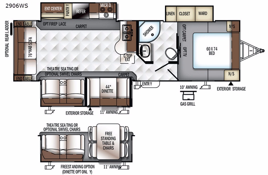 Exterior: Pass-through storage, power awning, outside speakers, and an optional exterior grill or kitchen setup.