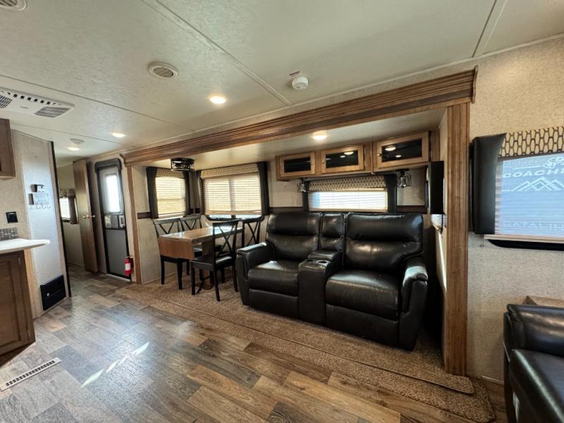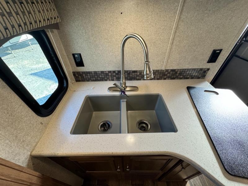 Kitchen: Equipped with solid-surface countertops, a double-door refrigerator, microwave, oven, and pantry. The dinette slide-out expands the central living space.