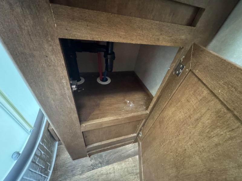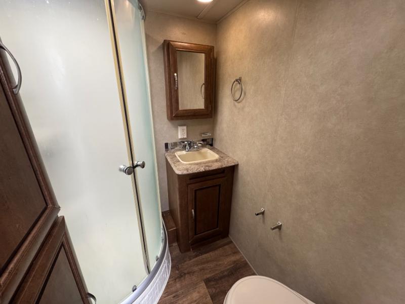 Almost straight in from the front entry door is the bathroom. Here you will find a wardrobe, radius shower, sink, medicine cabinet, and toilet. Now, talk about convenience!