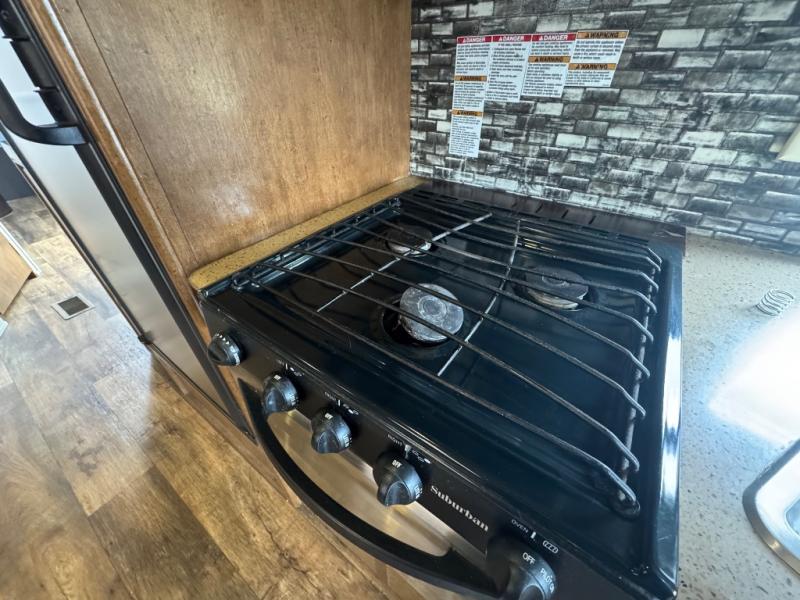 As you enter the travel trailer, along the rear wall you will find two lounge chairs and an end table. The slide out has a sofa and a dinette. Both the sofa and dinette offer great seating options during the day, and at night use this area for additional sleeping space. Along the opposite side of the travel trailer there is a double kitchen sink, three burner range, microwave, refrigerator, pantry, and corner wardrobe.