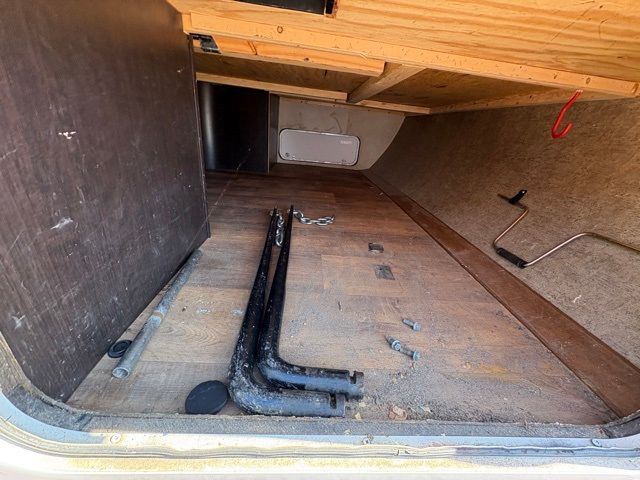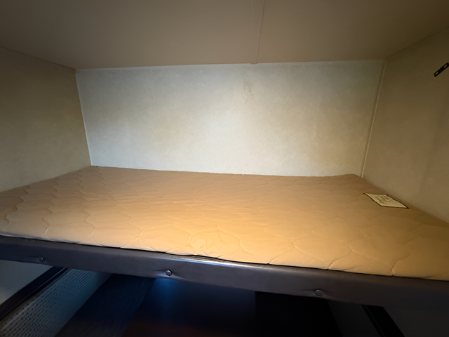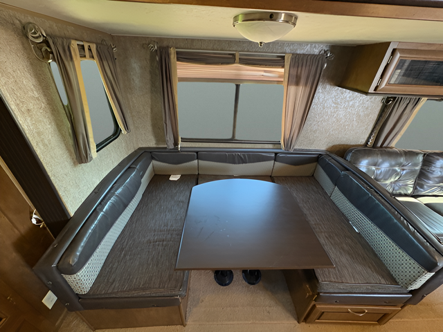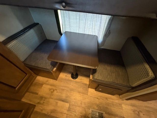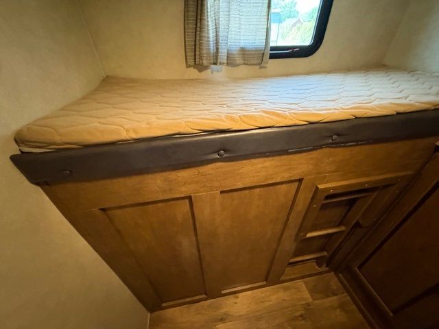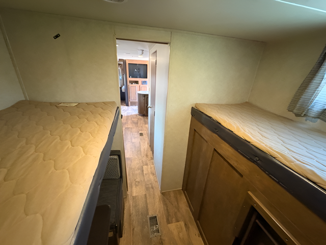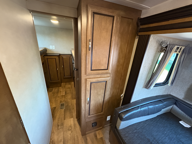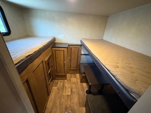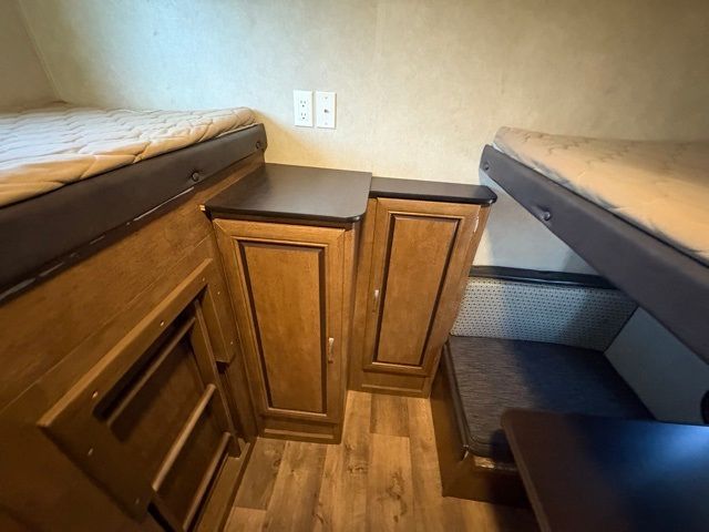 In the rear you will find the bunk house with a dinette and a hinged bunk above the dinette along the road side wall. Along the opposite side of the trailer there is an upper bunk. The room also has two wardrobes for extra storage.