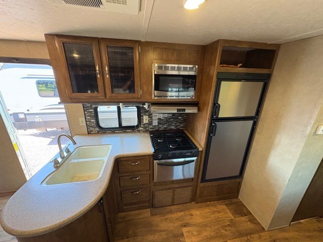 The main living and kitchen areas have a slide with a sofa and u-dinette. Next to the dinette is a pantry. Along the opposite side of the travel trailer there is a double kitchen sink, three burner range, microwave, and refrigerator. In the front of the living/kitchen area there is a nice size swivel box mentioned in the bedroom above which you are sure to enjoy watching TV on.