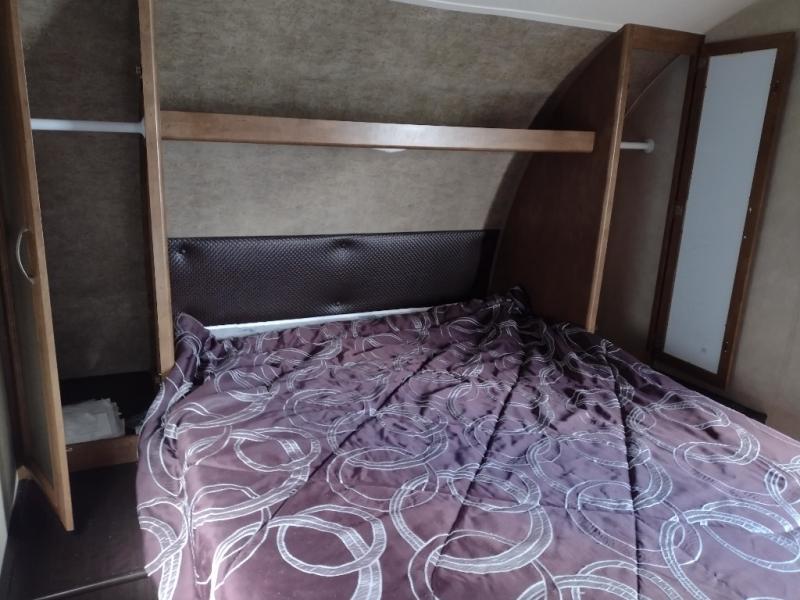 In the front bedroom you will find a RV queen bed with dual wardrobes and an overhead shelf, plus sliding doors for privacy.
