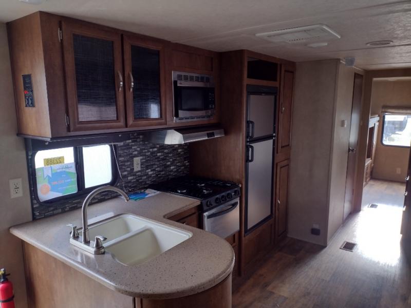 As you enter the travel trailer, to the left there is a l-shaped counter top with a double kitchen sink, three burner range, microwave, refrigerator, and a pantry. The opposite side includes a slide with a sofa and u-dinette. Along the front of the living/kitchen area there is an entertainment center for your enjoyment.
