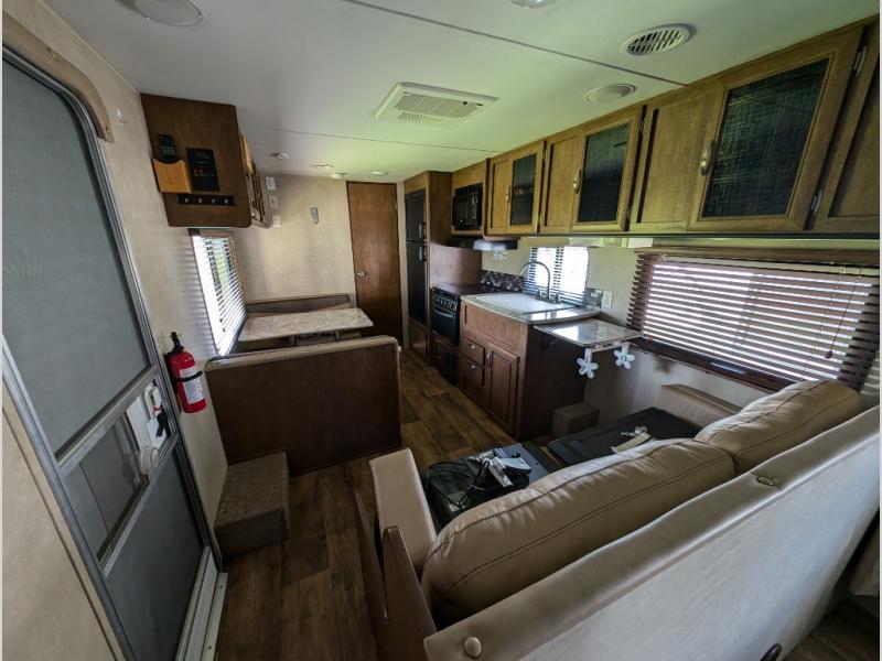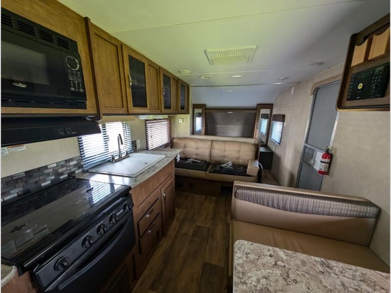 As you enter the travel trailer, to the left there is a dinette. On the opposite side of the trailer you will find a refrigerator, three burner range, microwave, and double kitchen sink. There is also a sofa in the main living area.