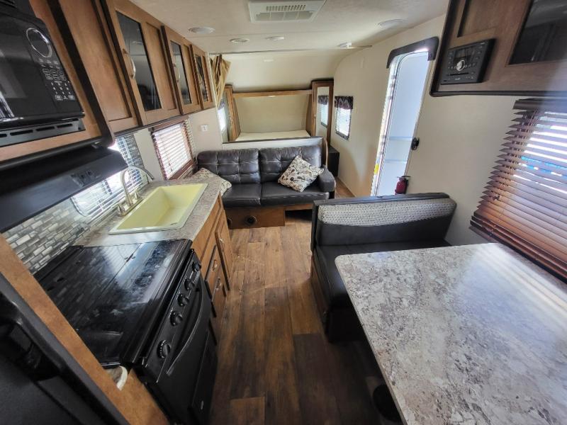 As you enter the travel trailer, to the left there is a dinette. Along the road side of the trailer you will find a refrigerator, three burner range, microwave, and double kitchen sink. There is also a sofa in the main living area.