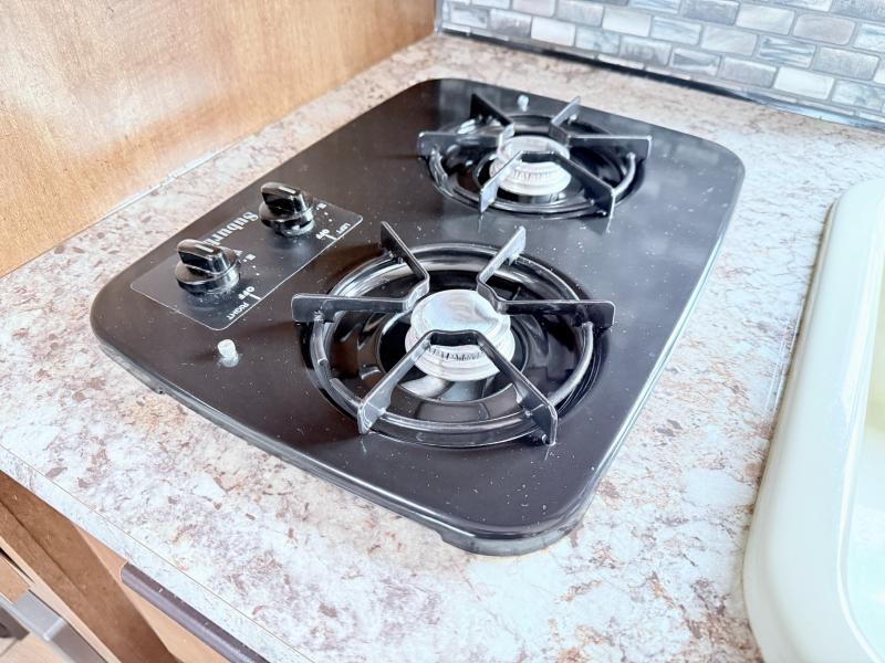 Along the road side of the trailer is where you will find the kitchen area. Here there is extra counter space, a refrigerator below the counter, an overhead cabinet, a sink, a microwave, a two burner range, and a pantry.