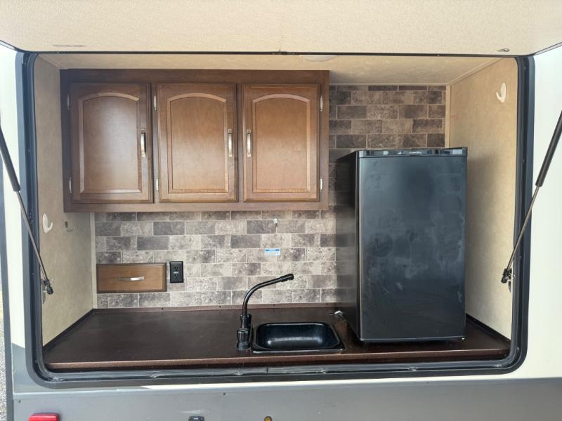 Outside you can enjoy the storage found in the pass through compartment and below the bunk, an awning, as well as an optional exterior kitchen which has a sink, drawer, and electric refrigerator. There is also an optional gas grill, plus more.