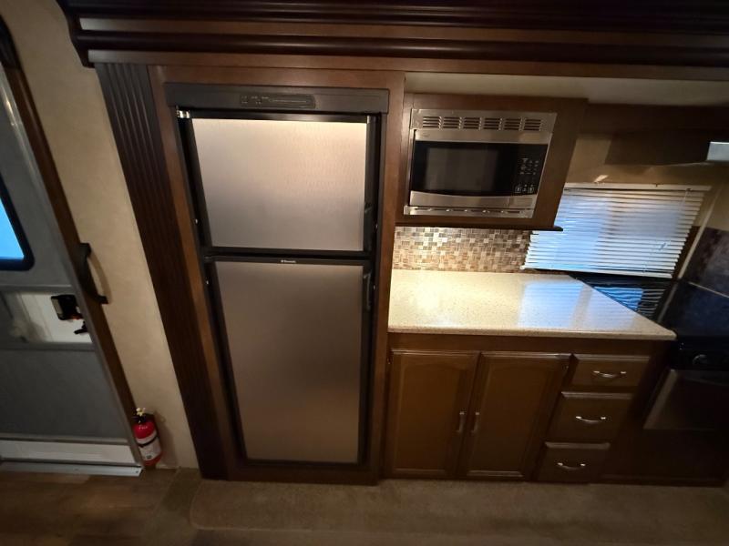 As you enter to your left there is a slide out with a refrigerator, counter space, and a three burner range with microwave above. Next to the slide you will find a large pantry for your dry goods. The opposite side of the trailer has a slide with a dinette and tri-fold sofa. In the middle of this area you will find a center island with a kitchen sink. To the right of the entrance there is a nice size closet and an entertainment center.