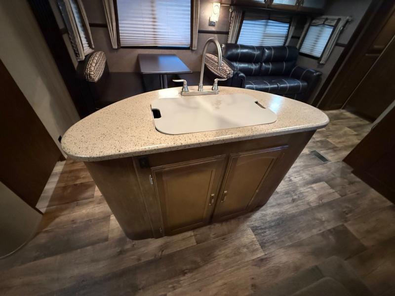 What I liked most: Outdoor kitchen has plenty of counter space and also cabinets up above. Plenty of storage in the living area. Large double door pantry in the kitchen. Plenty of inside kitchen counter space. Storage under booth dinette is easily accessible from the ends. Bunkhouse area has two bunks with a three-person couch and access to storage from the front underneath that. Large counter area drawers and space for TV. Very nice color scheme and decor throughout. The way the TV is situated makes the sofa living area feel a little separate from the dining kitchen area.