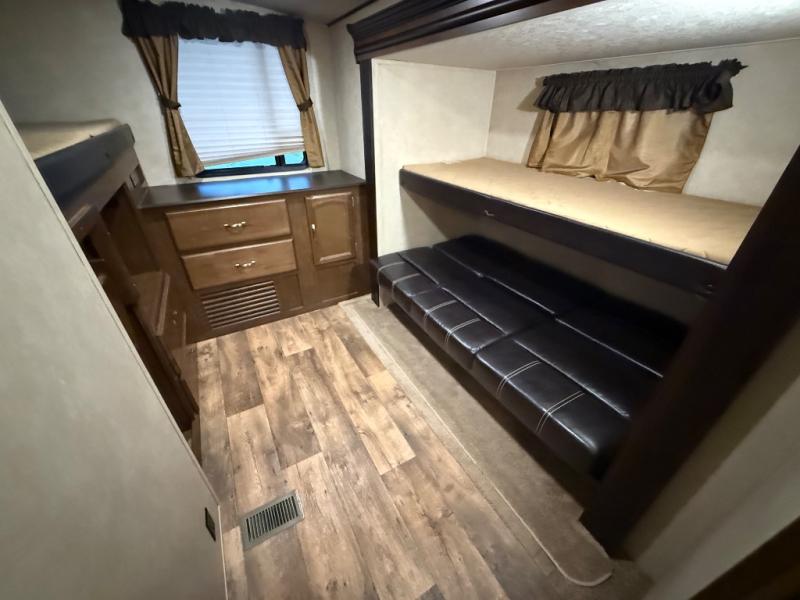 The rear bunkhouse includes a slide with a set of bunks with a trundle bed below. Along the rear wall there is a large dresser. You will also find a TV hook-up below a bunk, opposite the slide out.