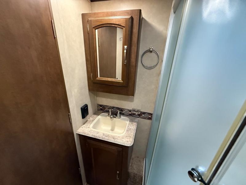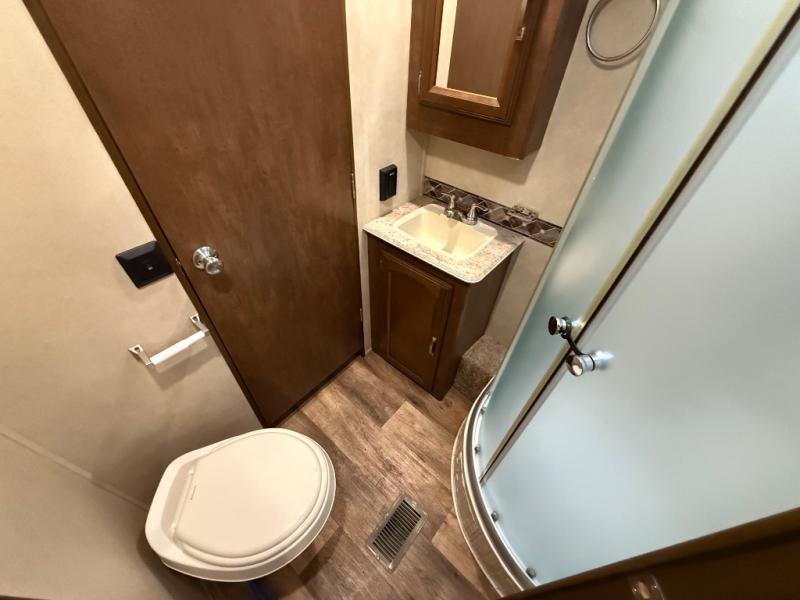 As you proceed towards the front of the trailer you will find the bathroom with a toilet, radius shower, sink, and medicine cabinet. There is also a private entrance from the bathroom into the bedroom.
