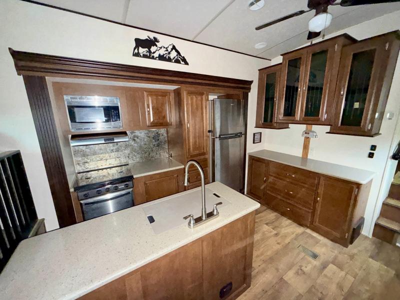 Enter the spacious kitchen where you will find double slides including a slide out free standing dining table with four chairs, and opposite a slide out refrigerator, pantry, and counter area with a three burner range with microwave above at the end. There is a hutch with overhead storage along the interior wall straight in the door, and a kitchen island with a sink.
