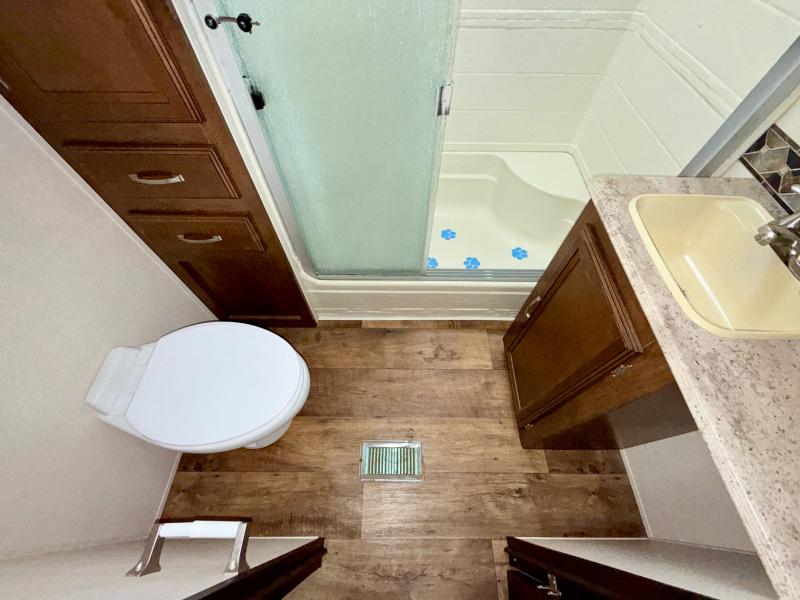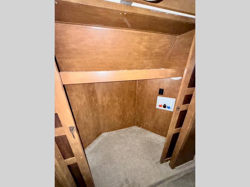 The door at the head of the hall in front leads into a master bedroom where you will enjoy sleeping away from the hustle and bustle of the living area. Sleep comfortably on a custom king size bed slide out that includes a nightstand and shelf nearby for your things. Opposite a dresser for your clothing, and a front wall wardrobe with shelf, plus it has been prepped for an optional washer and dryer if you choose to add the appliances.