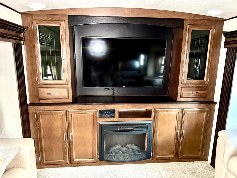 Next, head towards the rear to a raised inviting living space with dual opposing slides also. Here there are tri-fold sofas in each slide that face one another. Each can easily be made into a bed for overnight guests. There is also theater seating for two, and a full rear wall entertainment center with overhead cabinets, and a fireplace to enjoy. Beneath this area you will find two large pass-through storage bays for all of your outdoor camping gear, and more.