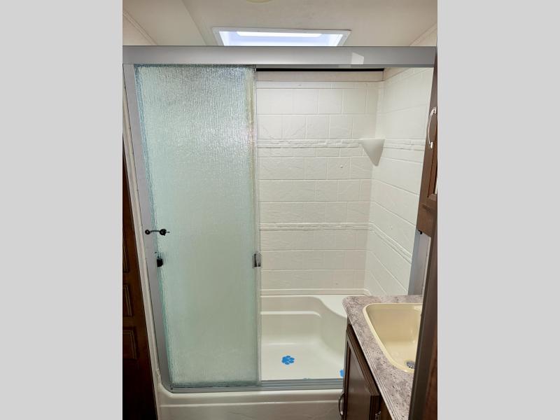 From the entry door mid-coach heading towards the front you will find a couple of steps up to a bedroom and complete bath. The bath is on your left at the top of the steps. Inside there is a residential tub/shower with seat, a toilet, linen storage, plus a sink with overhead medicine cabinet.