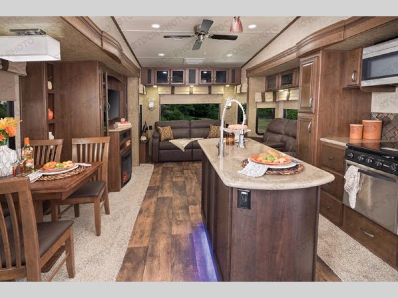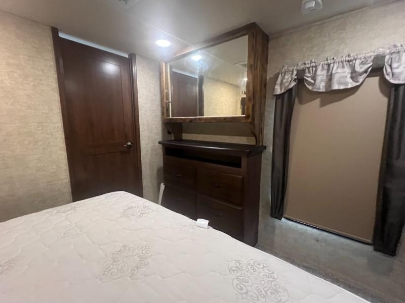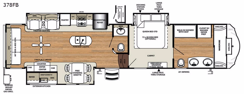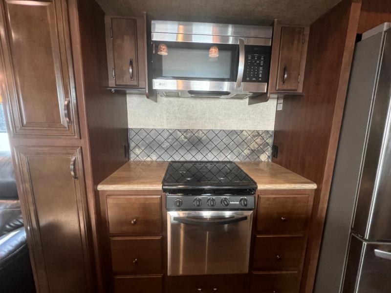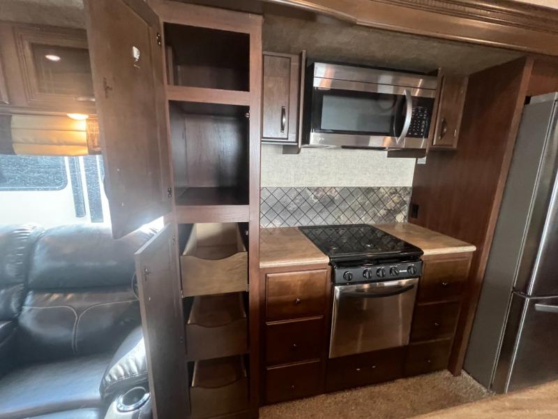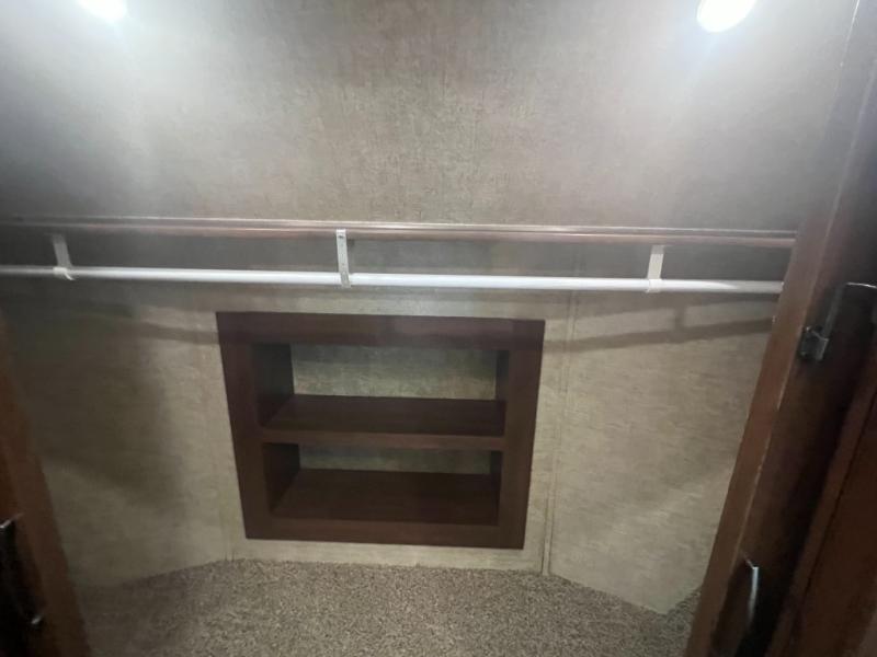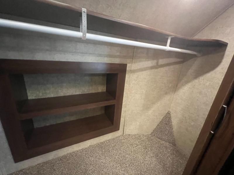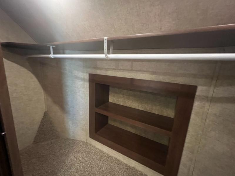 Storage shouldn't be a problem with all of the overhead cabinets throughout the fifth wheel as well as the large pass thru storage area outside. You can also enjoy the exterior kitchen which has a refrigerator, sink, drop down TV, and bumper mount swivel gas grill, plus more!