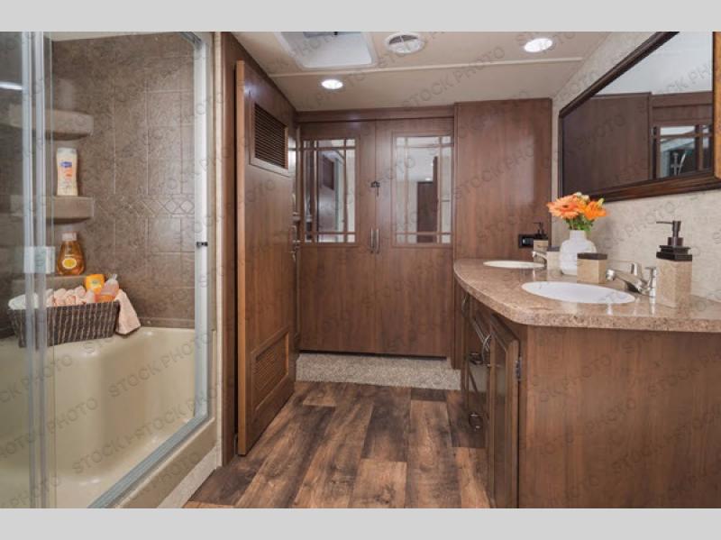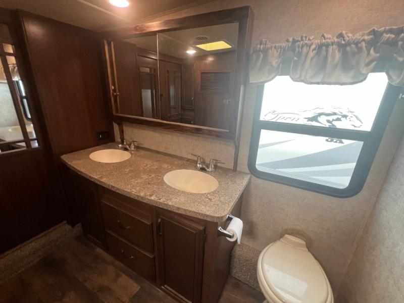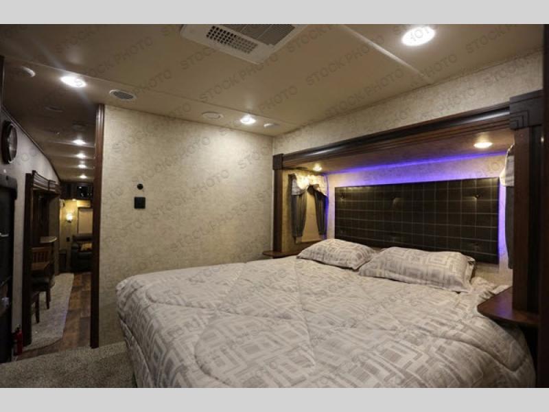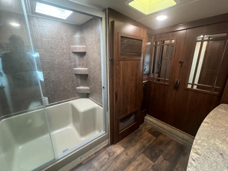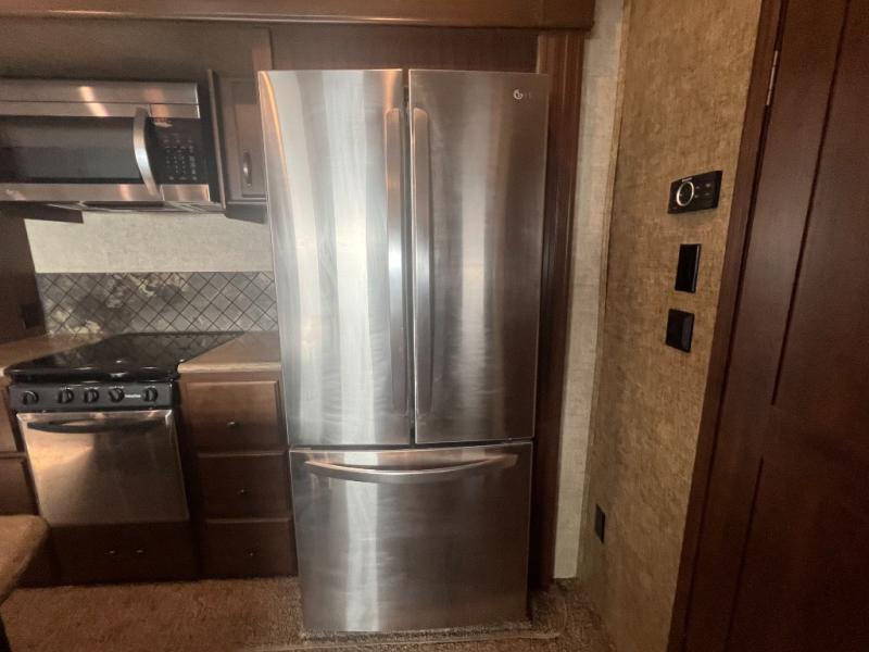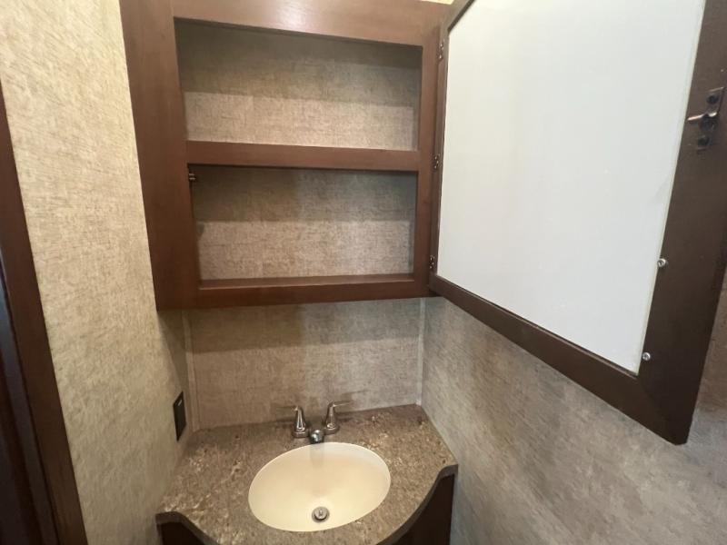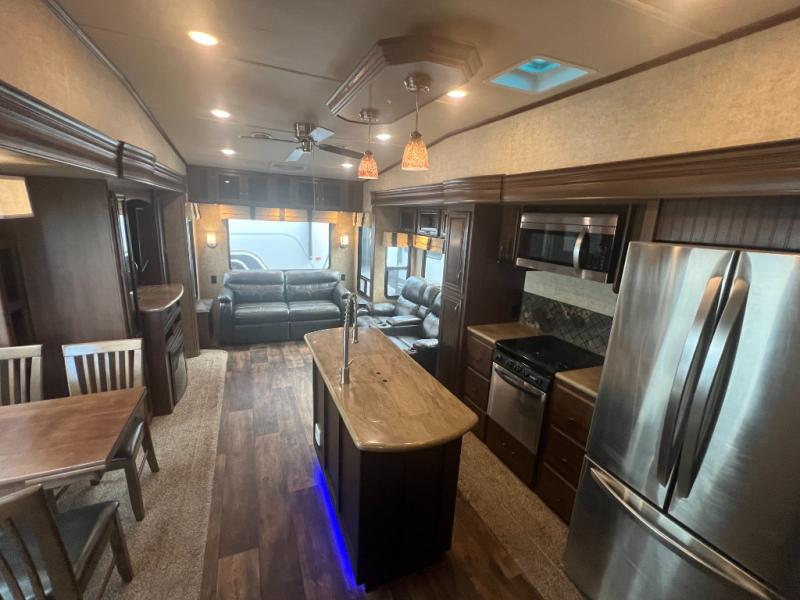 Storage shouldn't be a problem with all of the overhead cabinets throughout the fifth wheel as well as the large pass thru storage area outside. You can also enjoy the exterior kitchen which has a refrigerator, sink, drop down TV, and bumper mount swivel gas grill, plus more!