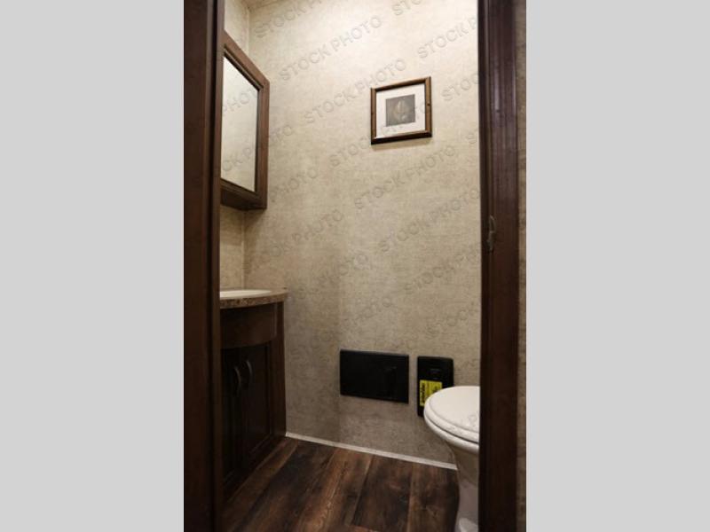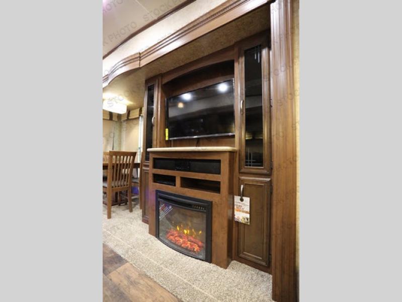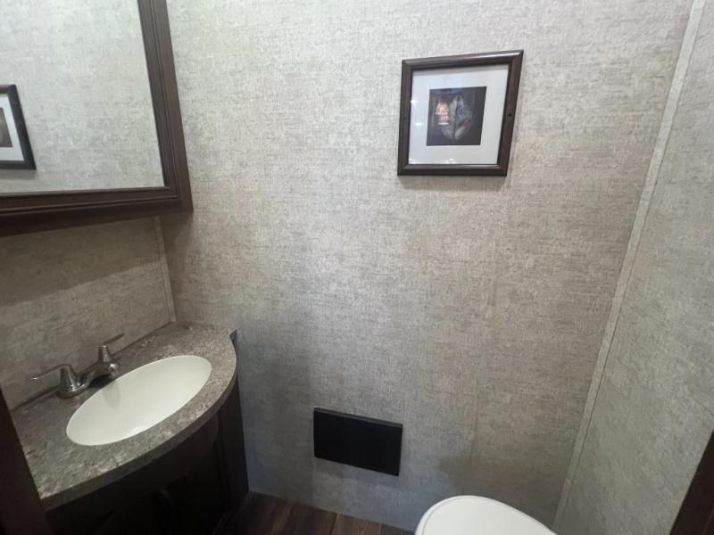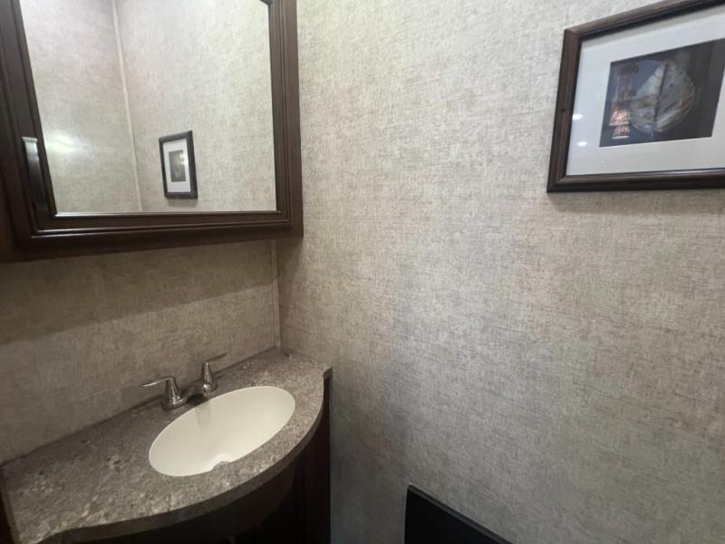 Step inside to your left to find a slide out free-standing dinette with chairs, and an entertainment center with a counter and fireplace below. There are cabinets for storage as well. Along the rear wall you will find a 80" hide-a-bed sofa for relaxing or sleeping. There is an additional slide with theater seats, a pantry, three burner range, microwave, and a residential refrigerator. In the middle of the kitchen you will find an island with a double sink and pendant lights above. Off of the kitchen there is a convenient half bath for family and friends.