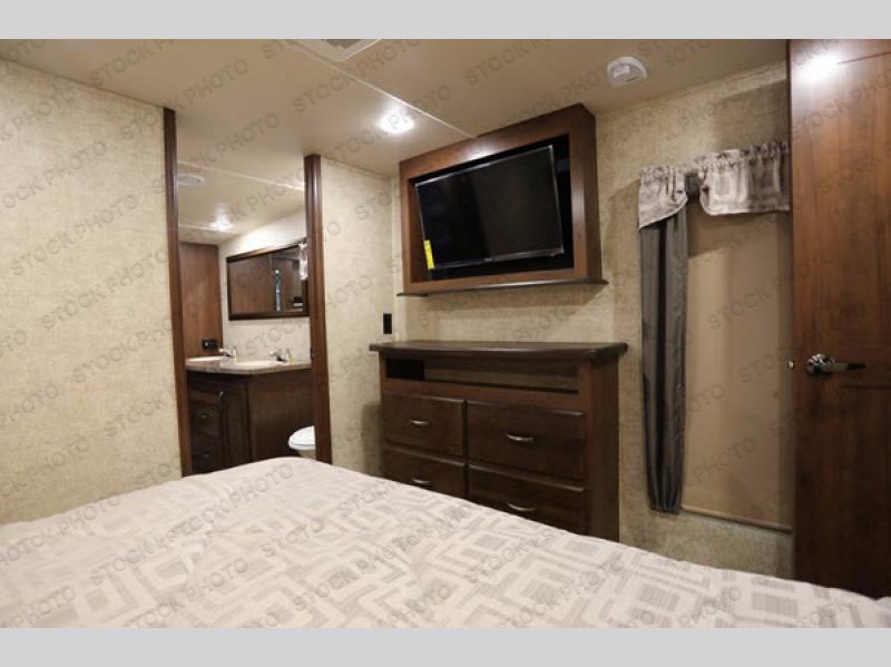 As you step up the front stairs, you will enter into the walk-through bedroom. The bedroom has a slide out queen bed and nightstands on either side. Or if you prefer a bit more sleeping space you can choose an optional king. Across from the bed there is a dresser with drawers and a TV box above.