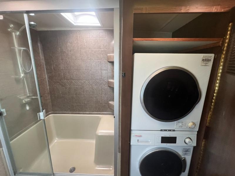 The front master bath is very large and spacious. Inside the bathroom there is a walk-in shower with seat, washer and dryer prep closet, toilet, and vanity with DUAL sinks. Along the front of the bathroom you will love the large wardrobe including shelving for all your clothing needs.