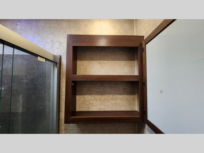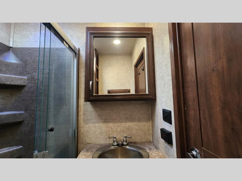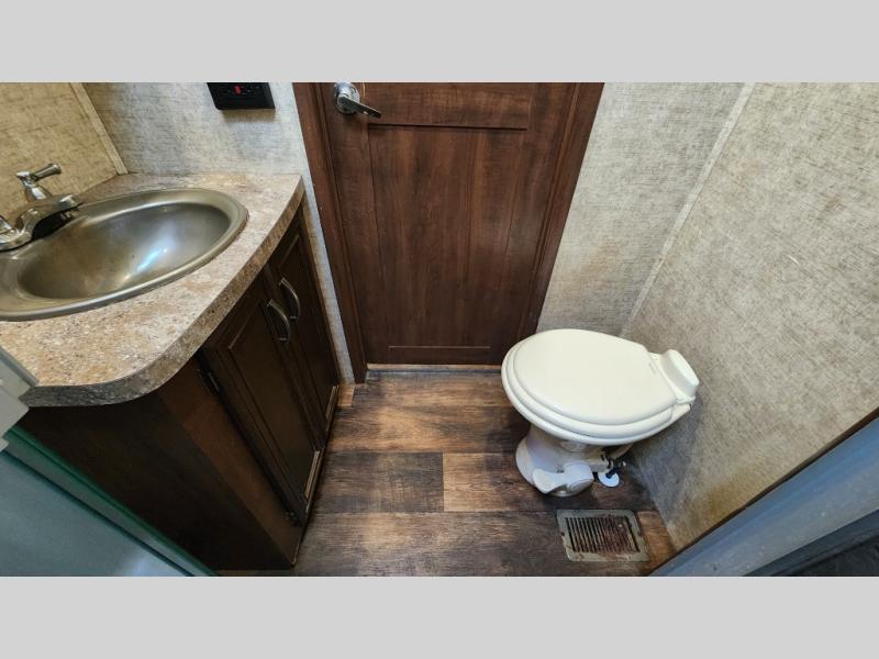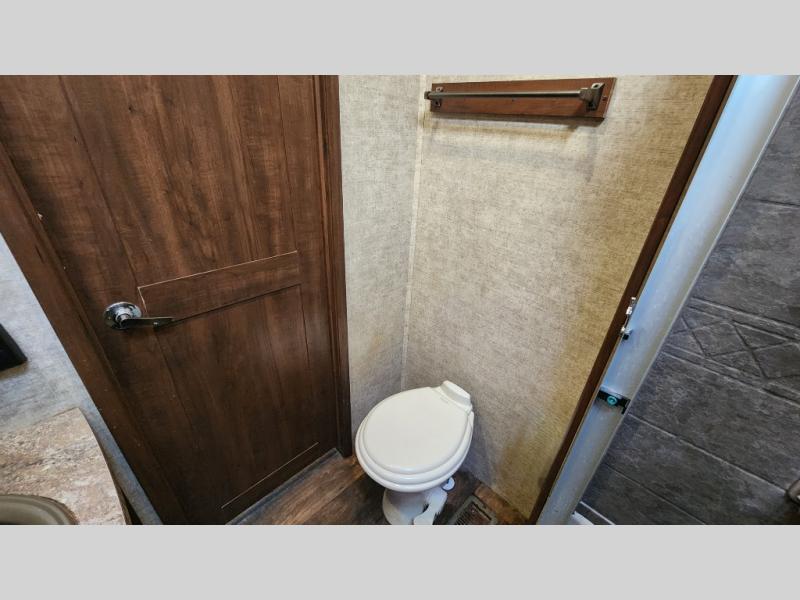 In the rear master suite, you’ll find a king-size bed, dresser, entertainment hookups, and a private entry door—offering a peaceful escape after a day of adventure. The large bathroom features a residential-style shower, porcelain toilet, and plenty of storage, giving you all the comforts of home on the road.