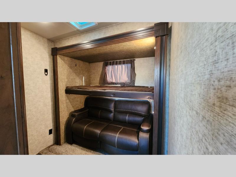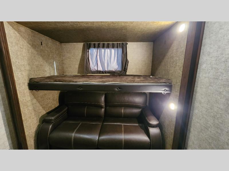 This destination trailer is designed to make everyone feel comfortable, thanks to its versatile floorplan with multiple sleeping areas. The private mid-bunk room is perfect for kids or guests, offering bunks, wardrobe storage, and extra space to relax or play.