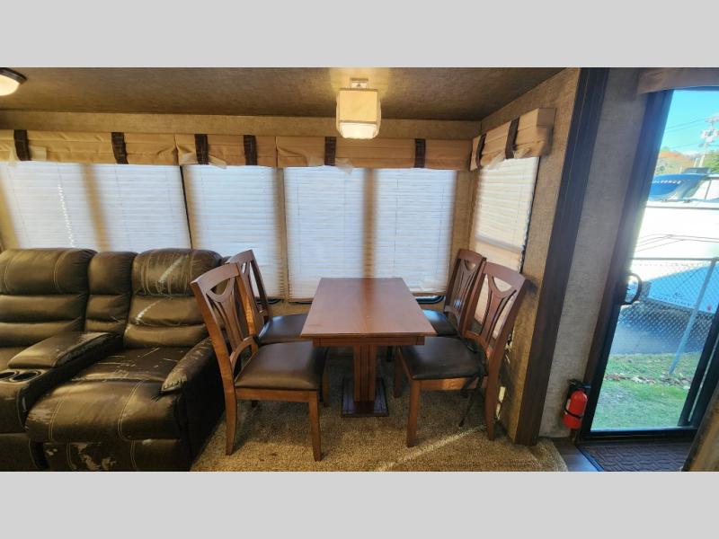 “Used = Smart. Save Big, Adventure Bigger.” This Unit Features a Fireplace; Theater Seating; Tri-Fold Hide-A-Bed Sofa; Free-Standing Dinette; Four Slides; Extra Room; Rear Bedroom with King Bed!